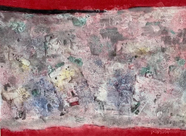 于是,在這幅畫面上就出現(xiàn)了那一塊藍(lán)色的東西,這塊藍(lán)色懸那么突兀,與整幅色調(diào)格格不入,是天泉嗎? 是天鏡嗎? 是與滿是傷痕的斑駁的對比抑或是反諷?是對歷史紛繁與理想單純的深刻隱喻?