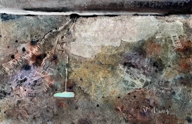 隱忍的情感張力,不僅僅是整幅畫面色調(diào)的營造,更重要得把所有的細(xì)節(jié)描述,嵌定在已知的方位。筆觸閃跳騰挪,情緒緊湊,滿是上天入地般地探行,尋找思想的突破口。
