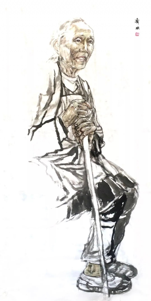 這兩年,謝濟(jì)斌通過幾次外出寫生,對(duì)筆墨表達(dá)有了新的體會(huì),創(chuàng)作也隨之有了起色,作品連續(xù)在省級(jí)美展上獲獎(jiǎng),受到了好評(píng)。通過水墨人物寫生實(shí)踐,他認(rèn)識(shí)到,對(duì)于中國(guó)畫來說,線條是主角和骨架,即古人講的“骨法用筆”。在學(xué)習(xí)過程中,他發(fā)現(xiàn)線條有多種表現(xiàn)形式——有的俊朗飄逸、酣暢淋漓;有的遒勁有力,如高山墜石;有的古拙頓挫,具金石凝澀之感。謝濟(jì)斌不拘泥于一家一派,而是根據(jù)不同題材、不同人物屬性,試用自認(rèn)為合適的線條去表達(dá)自己的情感,從中尋找最適合自己性格本體的那根“線”。而從墨法來看,他善于通過干濕、濃淡的變化來解決畫面塊面節(jié)奏、明度對(duì)比等情感訴求。比如他的作品《惠女坐像》(見下圖)表現(xiàn)的是身著平日服裝且面容慈祥的惠安婦女。畫面中的人物形象特征十分典型,服飾在視覺表現(xiàn)上也頗具畫意。畫家經(jīng)過觀察和思考,將端坐的人物以斜勢(shì)構(gòu)圖入畫,令畫面平穩(wěn)又不呆板。他把主要的筆墨表現(xiàn)放在了強(qiáng)調(diào)人物的臉部和手部上,用筆松馳、結(jié)構(gòu)到位。在人物皮膚的色彩表現(xiàn)上,他在固有色之外強(qiáng)調(diào)了冷暖的對(duì)比關(guān)系,染色用筆與線條用筆和諧統(tǒng)一,從中可見行筆的軌跡,又非描摹一路,使繪畫意味充足。在服飾的筆墨處理上,此作則更為痛快,線、面難分彼此,呈自由融合狀,不經(jīng)意間已把空間轉(zhuǎn)折交待出來。從中可以看出畫家在作畫時(shí)的情緒和手感都很好?,F(xiàn)實(shí)中,惠女那件紅色的外褂在陽光下顯得十分搶眼。于是,畫家有針對(duì)性地對(duì)其進(jìn)行了少許調(diào)整,提高了紅色的純度和明度,亮處還增加了鵝黃色。當(dāng)畫面一旦運(yùn)用了鮮明的色彩,尋求色彩的呼應(yīng)就必不可少。為此,畫家在藍(lán)色衣服和黑色褲子上都隨手涂抹了一些環(huán)境色,來豐富可能顯得生硬、沉悶的色塊,使畫面更加協(xié)調(diào)、透氣。惠女左右手戴的銀鐲子被染成不同色相,也呼應(yīng)了其身上的顏色,避免了左右對(duì)稱和單調(diào)重復(fù)的問題。整幅作品筆簡(jiǎn)意繁、一氣呵成,于蒼茫厚重處仍見靈氣浮動(dòng)。此作也有一些問題。謝濟(jì)斌如果在紅褂、蘭衣、黑褲三者之間再注意一下塊面大小以及明度的增減對(duì)比,那么畫面會(huì)更有視覺力度。