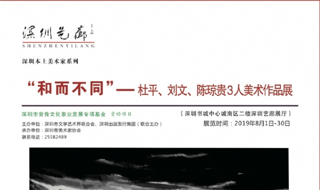 由深圳市文學(xué)藝術(shù)界聯(lián)合會(huì)和深圳出版發(fā)行集團(tuán)主辦、深圳市美術(shù)家協(xié)會(huì)承辦的“和而不同”—-杜平、劉文、陳瓊貴三人美術(shù)作品展,將于2019年8月1日下午3:00整在深圳中心書城南區(qū)二樓“深圳藝?yán)取闭钩?。歡迎大家參加展覽。