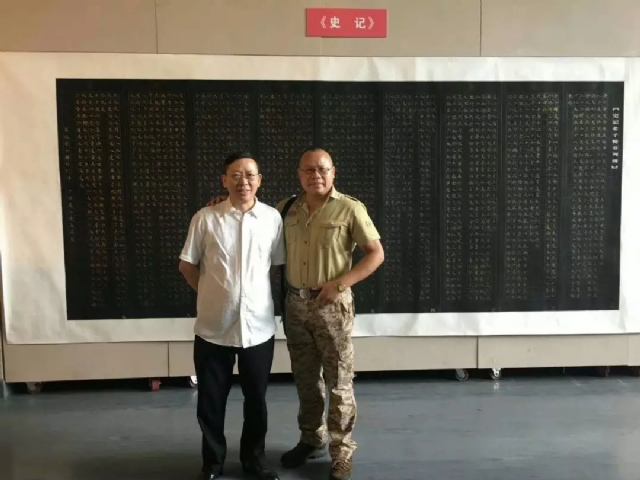 在“中華情·中國夢”大型美術書法展覽上,廈門市書法家協(xié)會主席劉堆來在連海明巨幅楷書作品《史記》前留念