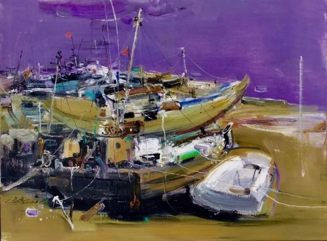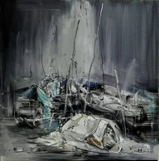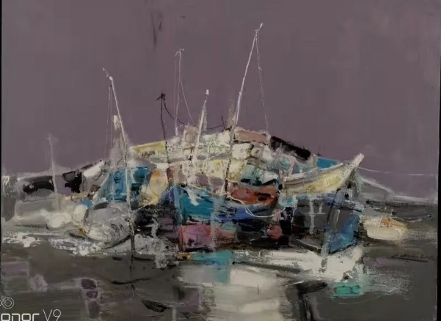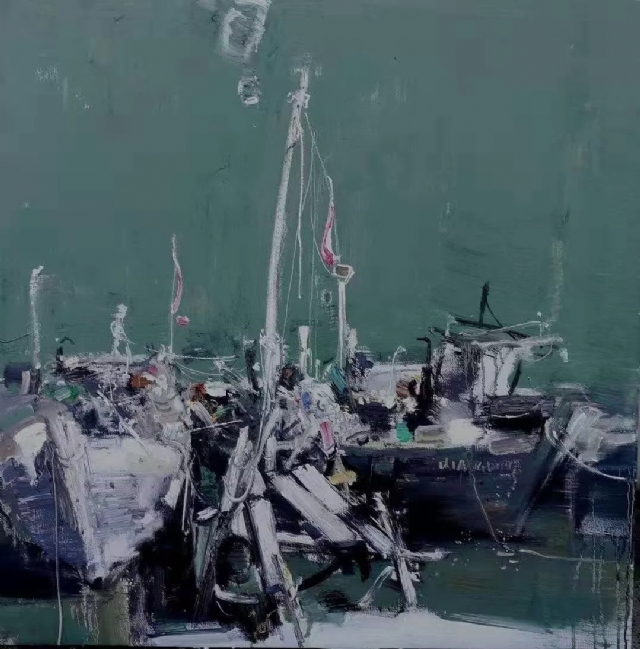 2015年他畫船。桅桿,纜繩,漁網(wǎng)……,他執(zhí)迷于船上的小東西,樂(lè)而不疲。船是他找到的另一個(gè)唯美的圖式。也成了他作品的一個(gè)主要題材,他到各地去畫船。