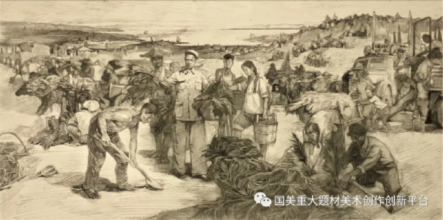春節(jié)臨近,兩位班主任看到我們的苦悶和焦灼,不停地鼓勵(lì)和幫助我們,還請來在歷史畫創(chuàng)作上有豐富經(jīng)驗(yàn)的章仁緣、翁誕憲、楊參軍等前輩對畫面進(jìn)行把脈。這是一次關(guān)鍵的指導(dǎo),意見有三:第一,縮小主體人物的比例,回到小色稿的效果;第二,增加中景內(nèi)容和沙地的層次,使畫面空間透視更加合理;第三,增強(qiáng)沙地的陽光感。在意見一致形成共識后,經(jīng)過一番大刀闊斧的改動,畫面舒服了,戰(zhàn)天斗地的勞動熱鬧感覺也呈現(xiàn)出來了。盡管還是比較粗糙,但畫面關(guān)系立起來了,我們總算可以回去過一個(gè)相對安心的春節(jié)。