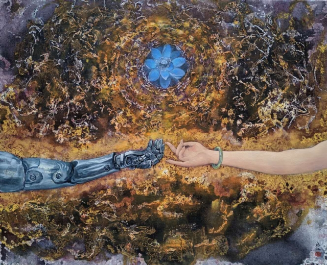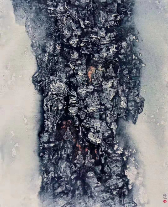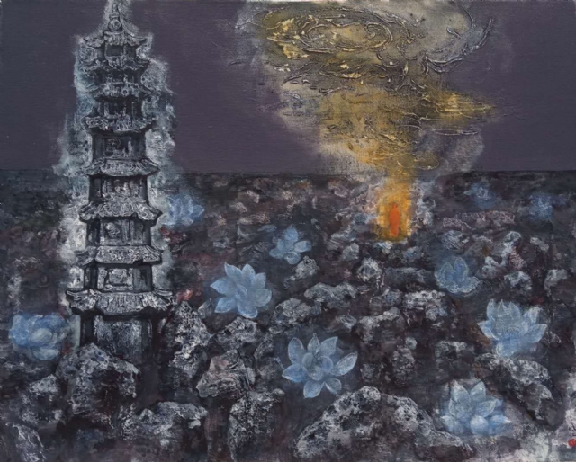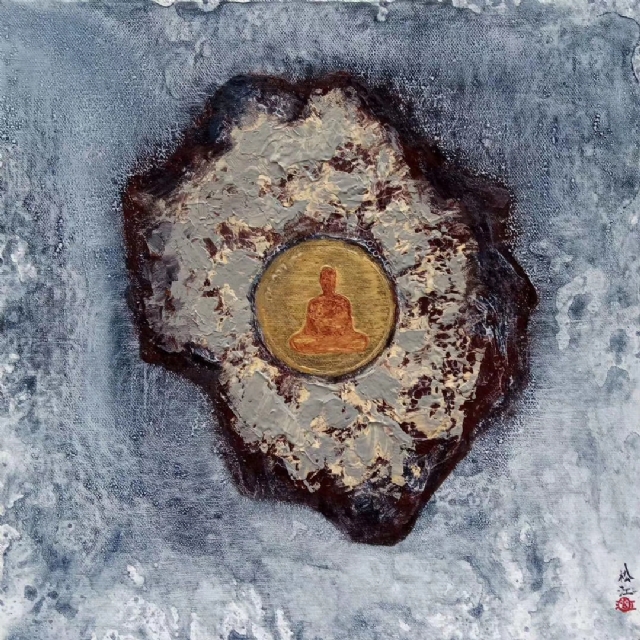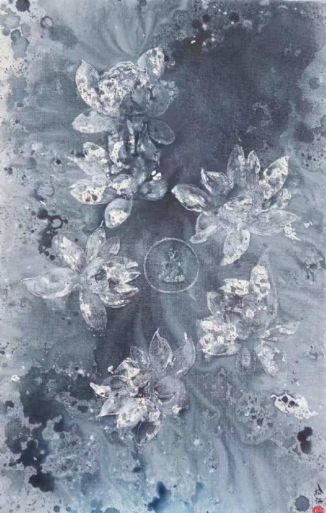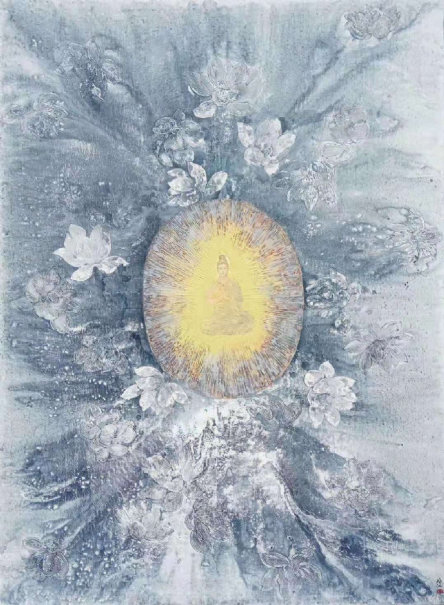 與其說李江在畫佛,不若說他在畫『我』。浮世輪回,或若寂滅、或若動蕩,一佛安坐,便已望斷前世與未來。這宛若『真我』對于宿命的抗辯,又或『真我』某種超脫后的明悟。斑駁之下,如若抵達(dá)、又或背離。一朵藍(lán)蓮沉浮,無聲訴說一個異鄉(xiāng)人『畫佛如我』,內(nèi)心對于佛性之于塵世的雙面人生。