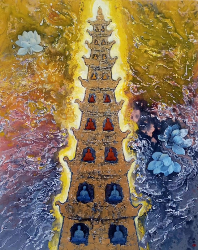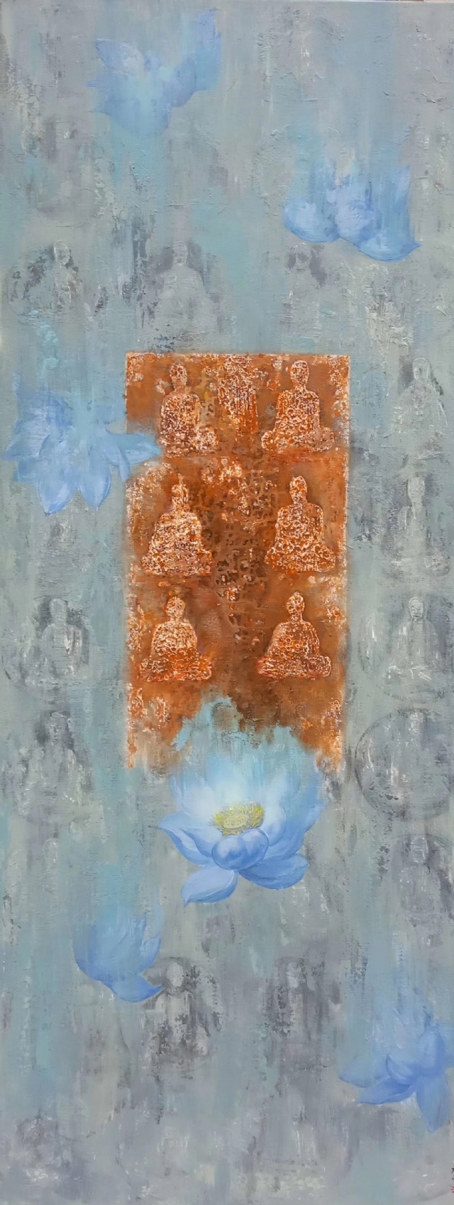 在樂山,李江無疑是一個異鄉(xiāng)人。無論他在這里是否已經(jīng)成家立業(yè),無論他是否已『被動或者主動』的融入這座城市的藝術(shù)人文圈子,無論他是否已然能夠操著『半洋不土』的當(dāng)?shù)胤窖耘c人交流,甚至無論他是否創(chuàng)作了大量與『大佛文化』相關(guān)的繪畫作品。在本質(zhì)上,他依然還是一個異鄉(xiāng)人。在他系列作品《佛·藍(lán)蓮》系列中,那朵時隱時現(xiàn)的『藍(lán)蓮』貫穿始終,無懼時光荏苒,無畏滄海桑田。