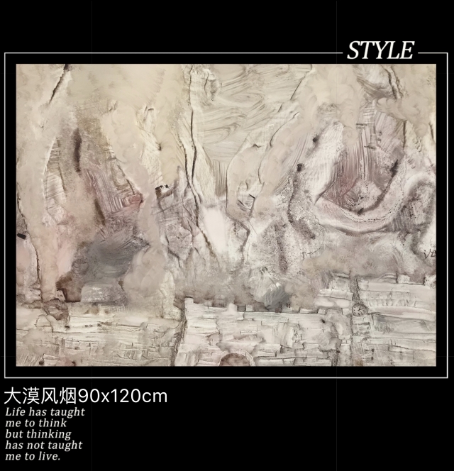 看了崔治中的作品,我在想,他這些具有思辯性、探索性、符號(hào)性的畫作,既不同于寫實(shí)主義的機(jī)械反映,也區(qū)別于表現(xiàn)主義的內(nèi)心抒寫,他立足于“長城”這一隱喻符號(hào),把他對(duì)征戰(zhàn)、戰(zhàn)火、防御、固守、開放、藍(lán)海、夢想等渲染其中,以表達(dá)他的視覺歷史觀,盡管這種視覺歷史觀或有偏頗或有模糊或有虛幻,但他的美學(xué)呈現(xiàn)卻是耐人尋味的。《光輝歲月》中那若隱若現(xiàn)的駿馬正從滄桑的城墻中奔騰而來,粗壯奔放的光芒給人以凝重和刺破之感;《大漠風(fēng)煙》的明亮色彩與黃沙暖煙相一致,時(shí)鐘嵌入墻體的歷史寓意十分明顯,以表達(dá)長城在蒼穹空曠之下的溫和柔軟性格,這是崔治中僅有的充滿暖色調(diào)的作品。他的《長城依然在》《戈壁與海洋》《千船過》《城墻上的一支船》《沙海之舟》別有意味,他把山體與大海、沙漠與海洋、城墻與航船揉捏在一起,靜與動(dòng)、虛與實(shí)、固守與開放、黃色與藍(lán)色,形成鮮明對(duì)比,既表明船堅(jiān)利炮轟毀不了長城,長城守護(hù)著這方廣袤的土地,又表達(dá)畫家渴望擁抱大海、走向世界的期許?!渡澈V邸返脑⒀晕兜朗滞怀觯瑲埧岬幕哪P蝕了曾經(jīng)航行的舟楫,那斑駁朽爛的木船擱淺在沙海上不能動(dòng)彈,只能追憶曾經(jīng)擁有的藍(lán)天白云、綠波蕩漾,歷史的嚴(yán)峻性恰恰體現(xiàn)在這里:過往的一切已成史跡,留下的是歲月蝕刻的蒼涼印記。