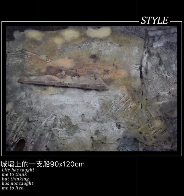 崔治中的憂患意識(shí)使他的作品具有鮮明的憂郁品格。他筆下少有明快明朗的色彩,幾乎無紅日、紅花、雄鷹、旌旗等意象,在低沉、冷調(diào)、灰暗的色調(diào)中勾勒長城的某一局部或幻化成墻、城、海、泉、船、車、梯、路、煙等相融的敘述構(gòu)成,除了那隨處可隱隱約見的三角形階梯的直線條外,歲月漩渦中的城墻磚石、山川草木、船體漿聲,都在歷史風(fēng)云中或流轉(zhuǎn)或枯寂或掙扎或眺望,看似隨意的信筆而就,卻飽含著畫家深邃而憂傷的情感?!尔}池烽火臺(tái)》的銅銹感,寫出了戰(zhàn)火磨礪后依然能頂住坍塌的不屈意志;《又是花開時(shí)》的石墻蜂孔與頑強(qiáng)生長在石縫中的小黃花,表達(dá)了時(shí)間深邃黑洞的遙遠(yuǎn)過去和此在新蕊的鮮明對(duì)比,表明歷史往往是活在當(dāng)下的思考;《金色寓言》在枯藤、嶙峋、斑駁陸離的黝黑基石上生長的層層不規(guī)則黃色巖石上飄浮著靈動(dòng)的金色霽霧,給人以溫暖的希冀,那上下部強(qiáng)烈的冷暖色差,述說著寓言的嚴(yán)酷與冷峻。這些作品有一個(gè)共同的審美指向:那就是歷史的刻痕永遠(yuǎn)無法在歲月中消逝,我們所感受到的只是自我認(rèn)知的歷史。因此,崔治中的圖像模糊與符號(hào)信息所扭結(jié)的畫作,也僅僅是畫家的個(gè)人體悟和表達(dá),給予人們的是閱讀鑒賞和引發(fā)思考。這,也許是崔治中作品的獨(dú)特之處和價(jià)值所在。