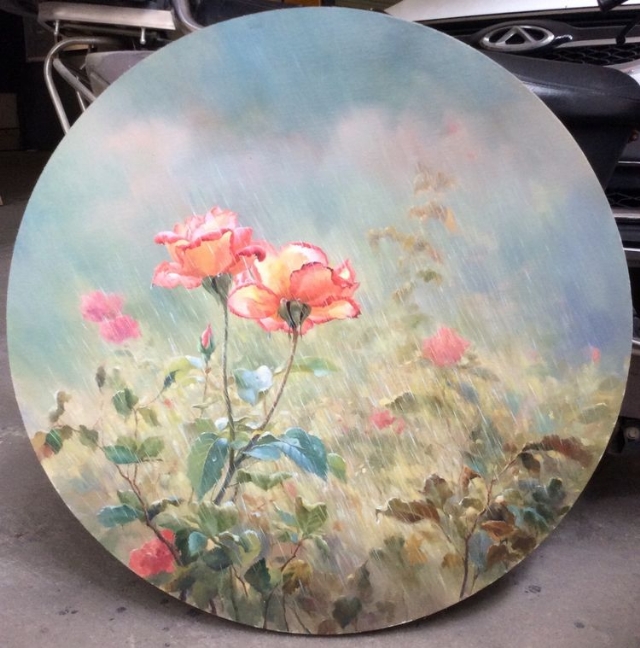 油畫作品《雨灈花更艷之二》