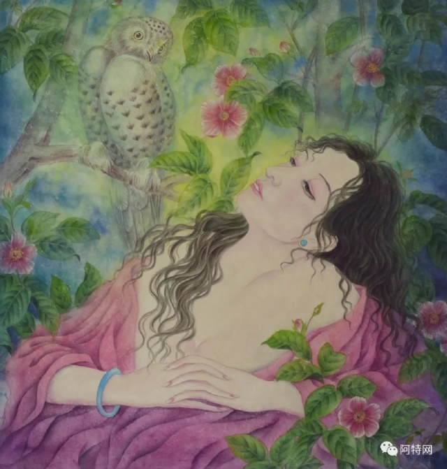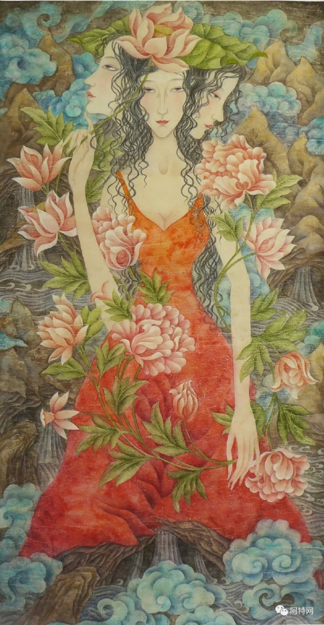 內(nèi)容方面,我主要以表現(xiàn)人物為主,融入花卉植物等象征性符號(hào)元素,表現(xiàn)女性人物形象,表達(dá)作為女性對(duì)自然,社會(huì),人生的種種感受。與現(xiàn)代唯美、精細(xì)、典雅的女性形象不同的是,我更多地試圖去挖掘人物的內(nèi)在精神,試圖讓觀者在面對(duì)畫面形象時(shí),能夠感覺到人物(其實(shí)多表達(dá)的是自我)當(dāng)時(shí)當(dāng)下的精神狀態(tài),而不是一個(gè)徒具空殼的“人”而已。在工筆畫創(chuàng)作過程中,我體會(huì)到如果過多地關(guān)注技法本身時(shí),人物的靈魂氣質(zhì)會(huì)隨著精細(xì)的描摹點(diǎn)染而弱化,在技法層面因?yàn)榻?jīng)常會(huì)占據(jù)畫家大部分的精力與時(shí)間,而常使轉(zhuǎn)瞬即逝的人物的“氣”,難以留駐畫面,使得作品最后效果常是雖筆法色彩精細(xì)耐看,但卻顯得比較呆板。所以我的工筆人物畫創(chuàng)作手法在學(xué)院教育的技法基礎(chǔ)下,作了相應(yīng)的調(diào)整和改變。比如不再過多注重細(xì)節(jié)精細(xì)工整的渲染刻畫,取而代之的是略顯寫意的運(yùn)筆方法,在個(gè)人心境和性情的引領(lǐng)下,較為感性和隨意地點(diǎn)染堆積等,希望通過類似意識(shí)流的繪畫方式抓住“神”韻。在色彩渲染方面,顏色的開闔更大,補(bǔ)色常并置使用,并融入水墨語言,以求獲得更為豐富,更具沖擊力的視覺效果,因此我認(rèn)為,我是以文人畫的意識(shí)進(jìn)行工筆人物畫創(chuàng)作的。