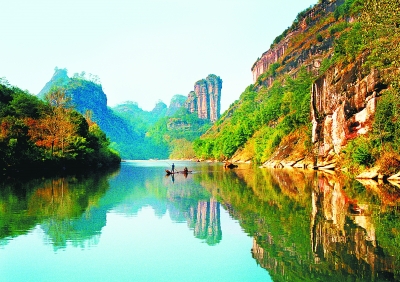 群峰連綿,郁郁蔥蔥。福建依山而居、三面環(huán)山,素有“八山一水一分田”之稱,境內武夷山、戴云山、太姥山、冠豸山等大大小小的山脈不計其數(shù),但名氣最大的還是世界文化與自然雙重遺產地武夷山?!拔湟纳皆诟=ㄊ∥鞅辈浚抢锓宸逵邢h(huán)繞,溪水隨山峰彎曲回轉……武夷山的溪水繞著山峰轉了九個彎,所以叫九曲溪。溪水很清,清得可以看見溪底的沙石。溪水很靜,靜得像一面鏡子?!保ā睹利惖奈湟纳健?,北師大版二年級語文下冊)碧水丹山,九曲棹歌,武夷山的美如詩如畫。“到武夷山游覽,可以爬山,也可以坐在古樸的竹筏上,在九曲溪上繞著山峰靜靜地、緩緩地、曲曲彎彎地漂行。溪水輕輕拍著竹筏,青山徐徐從兩邊退去,人們會有一種入詩入畫的感覺。”除了美,險是武夷山的又一特點。“天游峰——武夷山第一險峰。九百多級石梯,像一根銀絲從空中拋下來,在云霧中飄飄悠悠,仿佛風一吹就能斷掉似的。”(《天游峰的掃路人》,蘇教版六年級語文下冊)
