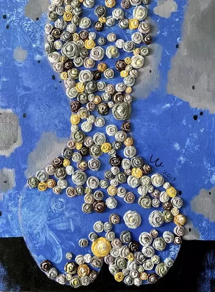 她的作品用最自然的表現(xiàn),在當(dāng)代油畫語境中游走。這些花甚至省略掉葉子,花朵永遠(yuǎn)盛開在一個(gè)特別的環(huán)境中: 一片飄浮在空中的紙箋上、一塊億年的蒼石里,一張癡情傾訴的戀人面孔中、一個(gè)綠色的祼女胴體間,等等均是不可能在現(xiàn)實(shí)中自然呈現(xiàn)的位置,但同時(shí)又是最理性的位置,以浮雕似的描繪把花的最原始狀態(tài)呈現(xiàn)于觀者的眼前。無論是雅拙的正襟直面,還是或圓或方的茂然鋪陳,胡山山的玫瑰永遠(yuǎn)以如砌似雕的厚度,把生命中最鮮活的真實(shí)之美呈現(xiàn)在你面前。