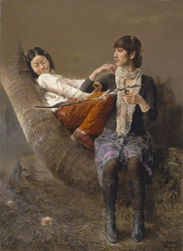 《雨夏》的人物原型是我的妻子和女兒:她們有時(shí)像鬧山的麻雀,唧唧喳喳歡快嬉鬧,臉上“開(kāi)岀”燦爛的“花朵”;有時(shí)莫名地感傷流淚。女性的這種心理和情緒猶如夏日的天空,時(shí)而陽(yáng)光明媚,時(shí)而陰云密布。為表現(xiàn)女性這種變化無(wú)常的心理和情緒,我選擇夏日驟雨將至?xí)r這個(gè)極富情趣的瞬間作為依托,既與畫(huà)面氛圍和情調(diào)相合,又暗示了人物的心理狀態(tài).作為“宇宙之精華、萬(wàn)物之靈長(zhǎng)”的人,有著千姿百態(tài)的變化和豐富的表情,反映出其體型、外貌、生活經(jīng)歷、內(nèi)心世界等,在某種意義上也折射出時(shí)代生活的特質(zhì)。