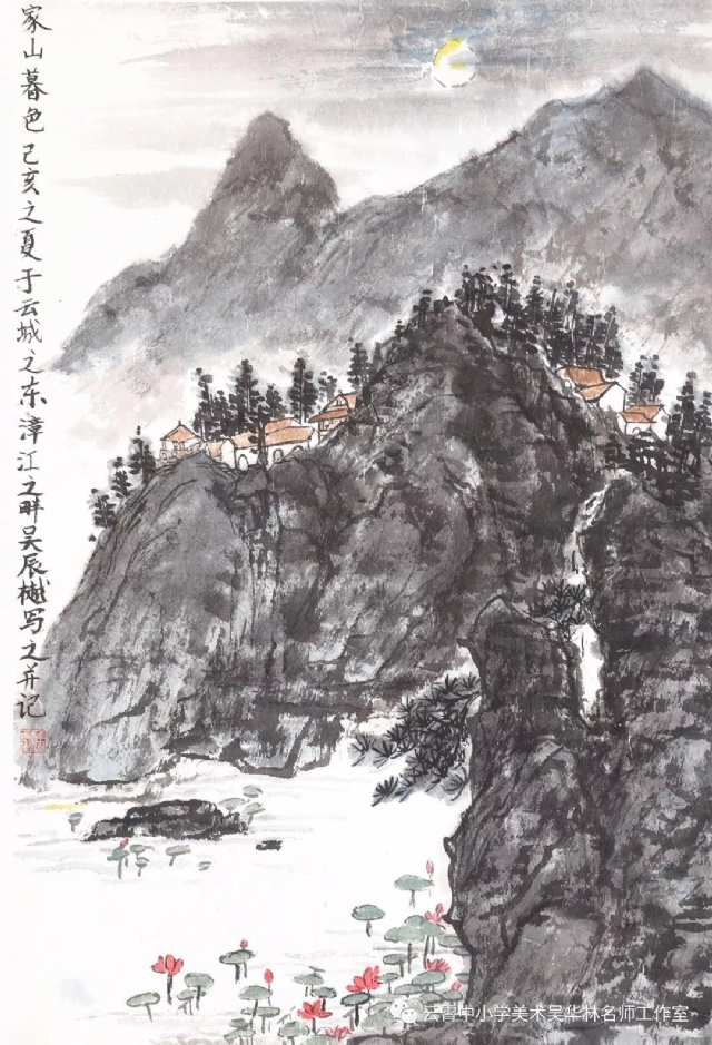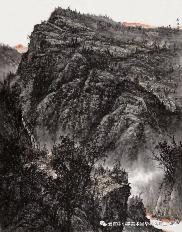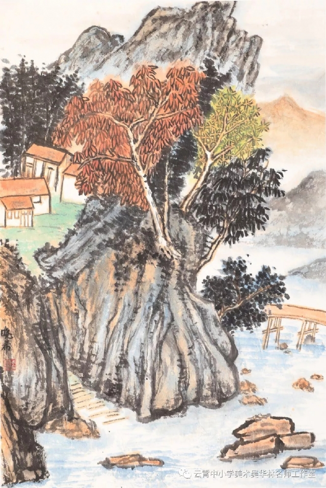 教師有計劃進(jìn)行教學(xué)嘗試,首先以《芥子園》為教材范本,由傳統(tǒng)筆墨入手,先用分塊教學(xué)的形式,由樹、石、山、房屋、亭臺樓閣,舟楫,云霧,水口、瀑布流泉等等各塊分別安排課時,以示范臨摹為主,解決基礎(chǔ)問題;第二步進(jìn)行組合練習(xí)(提出具體要求,比如畫面上必須出現(xiàn)何種景物等等,或教師半扶半放,總體構(gòu)圖,示范部分再讓學(xué)生添畫完成等;第三步就是教師命題,或提供景觀圖片(不方便組織寫生,只能出此下策),學(xué)生嘗試創(chuàng)作。學(xué)生雖然基礎(chǔ)不同,年齡不同,學(xué)段不同,但是在短期里學(xué)習(xí)還是取得較好的學(xué)習(xí)效果,這一點可以從本次展示的作品中看出來。