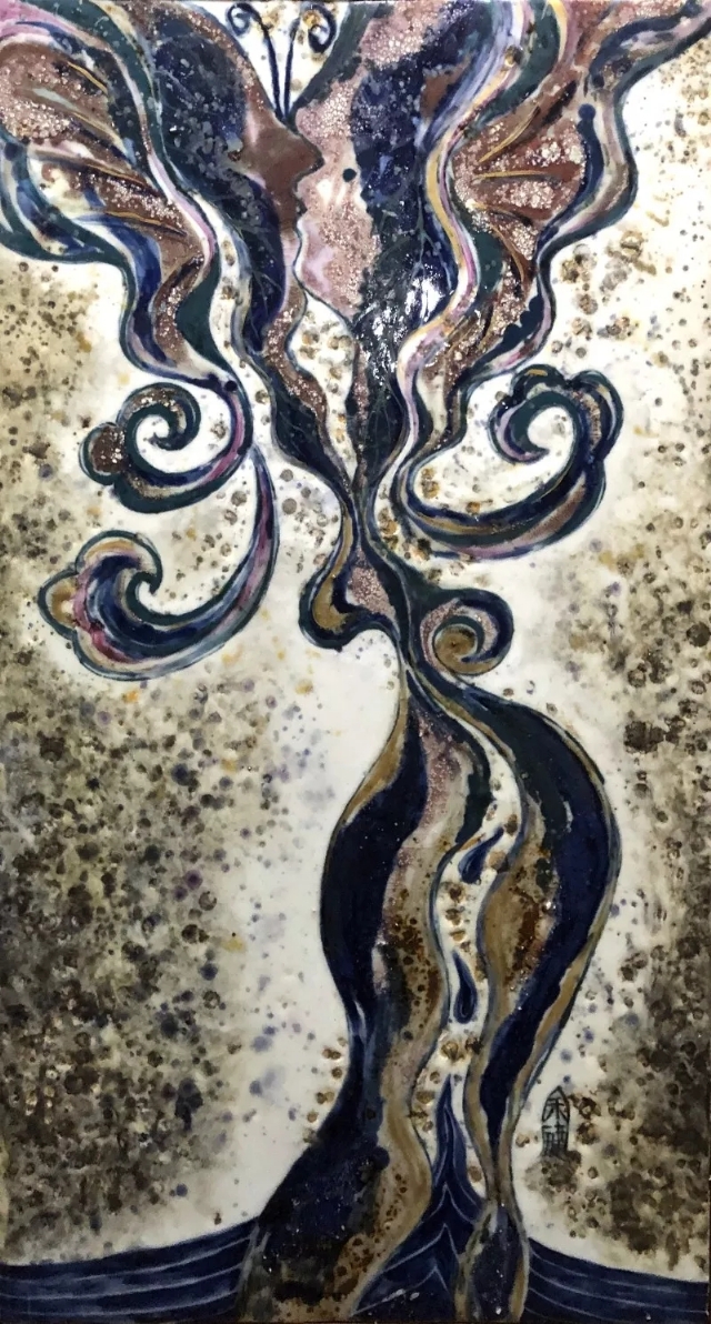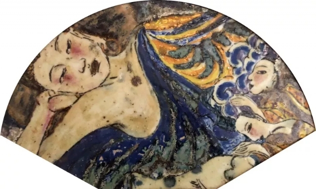 余鍵雖也鐘情釉彩,但卻本能地堅(jiān)持純繪畫的學(xué)術(shù)立場(chǎng),不但移植超現(xiàn)實(shí)主義中國(guó)畫的主題精神,連寫意筆墨也搬用過來(lái),因而為瓷板畫孕育了中國(guó)血統(tǒng)。同時(shí),也將她的藝術(shù)創(chuàng)造性,發(fā)揮到瓷板畫本體語(yǔ)言的開創(chuàng)上,在瓷面施灑粗礪添加物,克服了平滑釉面裝飾易顯浮華油俗的工藝品性,使其陡增粗獷美感,而成無(wú)可挑剔的純繪畫,比水墨畫厚重有韻味,較磨漆畫質(zhì)樸而自然,這是她的最有價(jià)值的成果,可以說,也是對(duì)新生瓷板畫的重要貢獻(xiàn)。