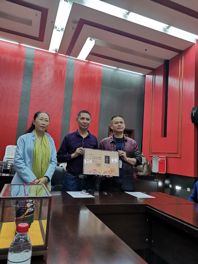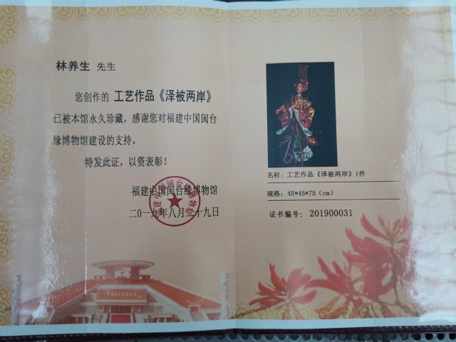 2019年6月8日參加福建省工藝美術(shù)學(xué)會(huì)民間工藝專業(yè)委員會(huì)在閩臺(tái)緣博物館主辦,中國(guó)文化遺產(chǎn)日暨中國(guó)工藝美術(shù)學(xué)會(huì)美術(shù)科普教育日活動(dòng)展示,作品被收藏,今天發(fā)證書合影留念。