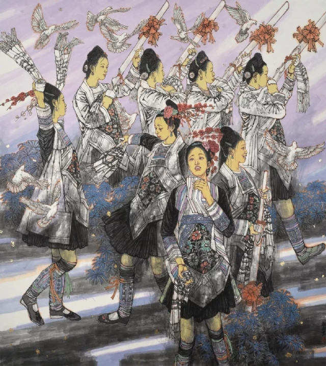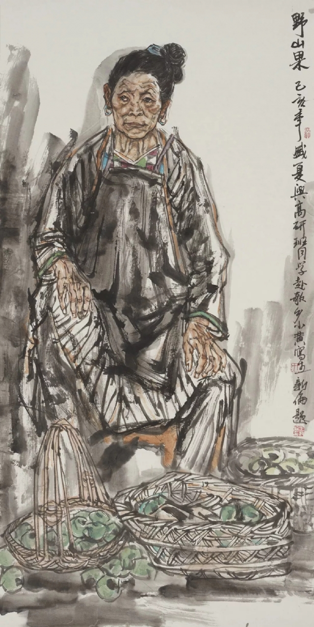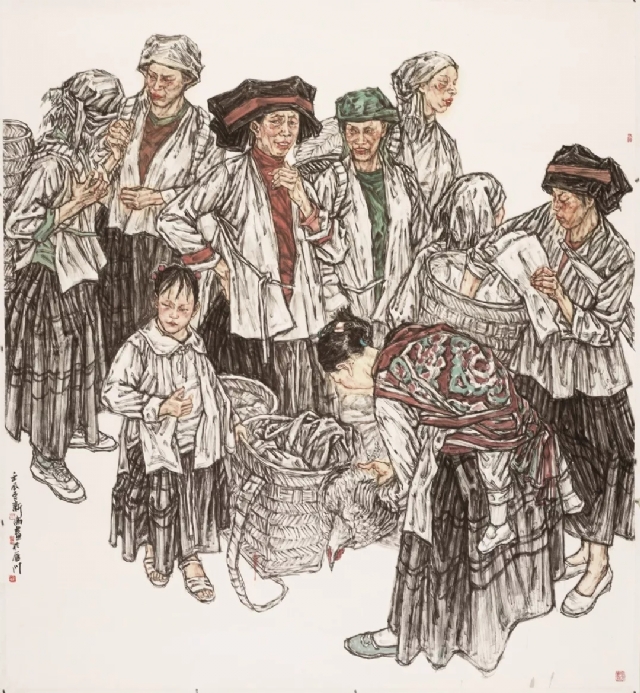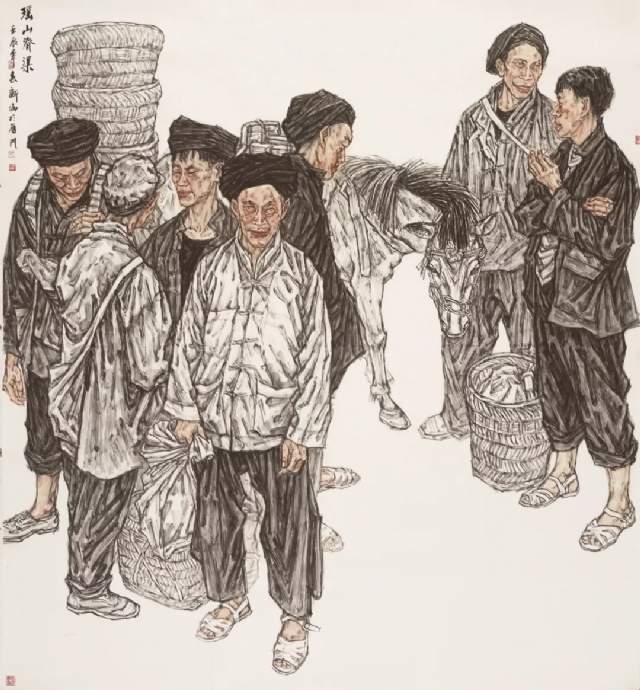 在畫(huà)作《父老鄉(xiāng)親》中,那些父老鄉(xiāng)親雖有迷惘,但神情卻是堅(jiān)毅的,正如米開(kāi)朗基羅所雕刻的被綁的奴隸雖然被綁,但卻是不屈服的。那些凝視遠(yuǎn)方的父老鄉(xiāng)親沒(méi)有自怨自艾,而是蘊(yùn)蓄著力量,準(zhǔn)備遠(yuǎn)行。在畫(huà)作《鐵路修到我家鄉(xiāng)》中,中國(guó)少數(shù)民族同胞在打開(kāi)自己的世界時(shí)沒(méi)有驚慌和恐懼,而是興奮和喜悅的。他們真切地感受到中國(guó)當(dāng)代社會(huì)的進(jìn)步是和自己的發(fā)展密切相關(guān)的。他們不但在中國(guó)當(dāng)代社會(huì)這種發(fā)展中感受到切實(shí)的進(jìn)步,而且看到了自己的光明未來(lái),那種喜悅是情不自禁的,由衷的。在畫(huà)作《瑤鄉(xiāng)春色》 《瑤山脊梁》和組畫(huà)《趕墟》中,王新倫既充分表現(xiàn)了中國(guó)當(dāng)代社會(huì)鄉(xiāng)村人的生活變化,也充分展現(xiàn)了他們嶄新的精神風(fēng)貌。鄉(xiāng)村人趕墟可以說(shuō)是鄉(xiāng)村人難得的自由的社會(huì)活動(dòng)。尤其是這種主動(dòng)出去與外界的交流,既有貨物商品的交易,也有思想感情的交流。