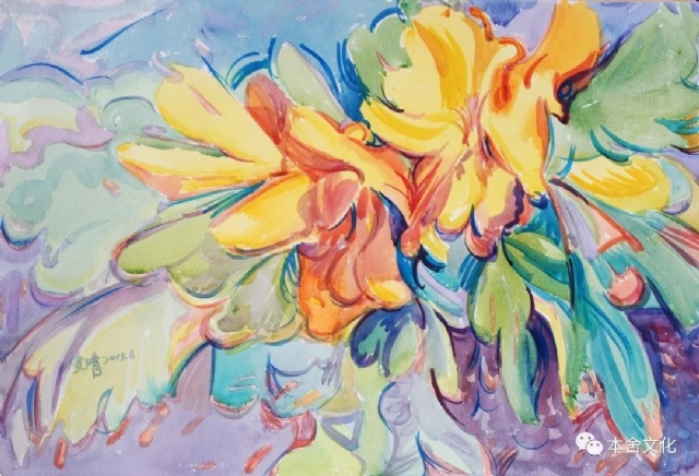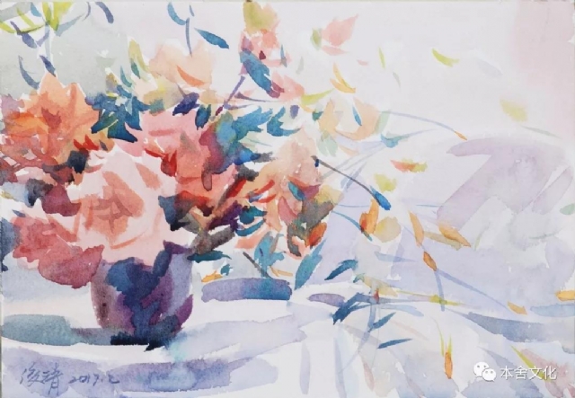本次作品雖多以風(fēng)景花卉小品為主,卻能在其布局與色調(diào)地追求上,感知俊清兄內(nèi)心高雅之意。其畫拋棄繁瑣,凝練筆觸,干凈瀟灑,無拖泥帶水之詬。格局如高山流水,潤物無聲;色調(diào)如鄰家小妹,淡雅脫俗。細(xì)細(xì)品味,其章法自成一體,錯落有致;其節(jié)奏律動,急驟舒緩,松弛有度;其著色韻味有如一股暗香,彌漫開來。畫如其人,陽光帥氣,泰然處之,已顯大師風(fēng)范。