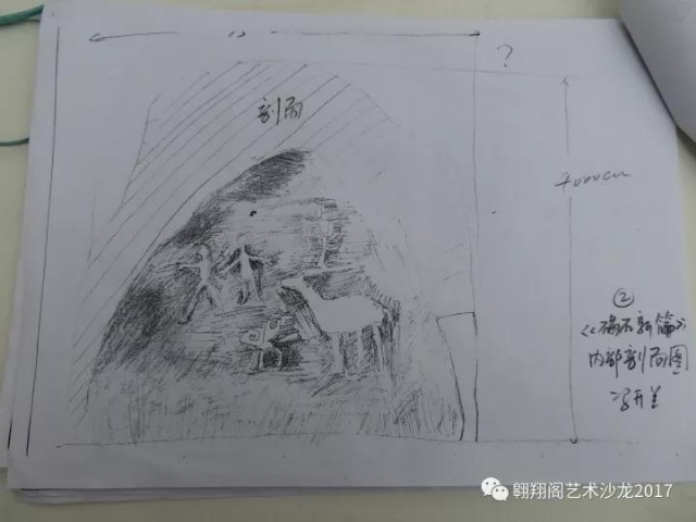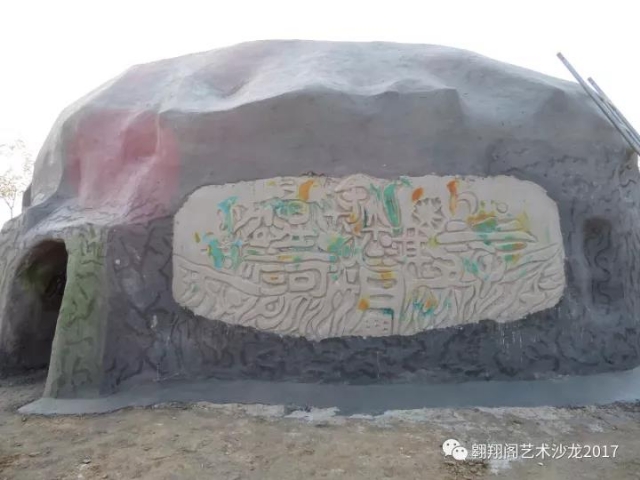 但沒有現成的石頭,去采集肯定很費時又要花費巨資。所以在與工程人員溝通之后,決定用水泥塑造一塊仿真石頭??紤]到鑫嘉源園區(qū)是以旅游觀光為主的生態(tài)園區(qū),作品應該能具有更好的互動游玩的功能,因而決定構建一個內腔,如山洞般可供游人穿越、探索。洞壁上繪制反映古人類生活的巖畫。讓更多的當地百姓能從更多的角度去欣賞這樣一個作品。構思形成后,就繪制了草圖交與組委會審核通過。