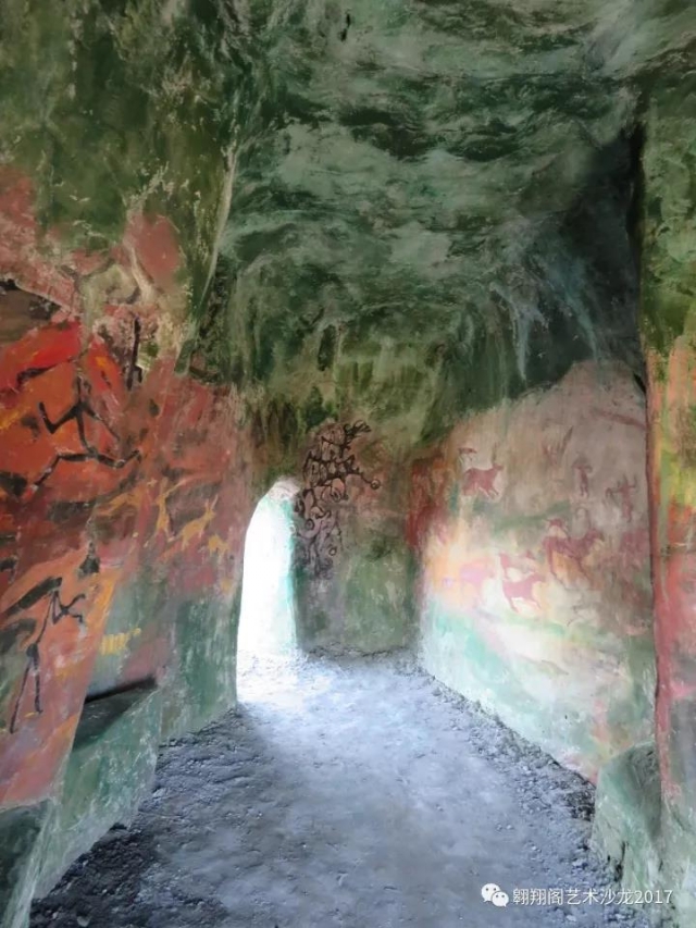 27日,用一天的時間,與來園區(qū)辦事的客串藝術家小黑合作,把洞內巖畫整體鋪了一遍。效果也很出乎意料。因為這么多年我一直畫抽象,實在不知道這把握巨像畫面的能力也在與日俱增。