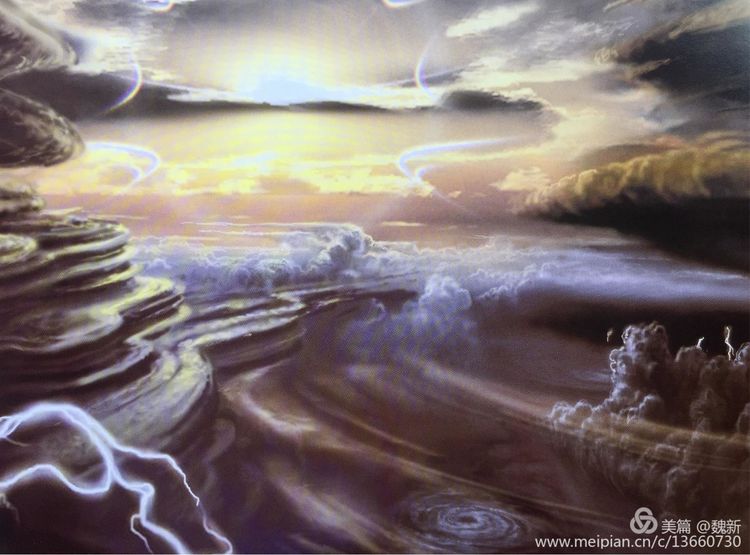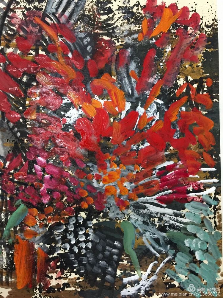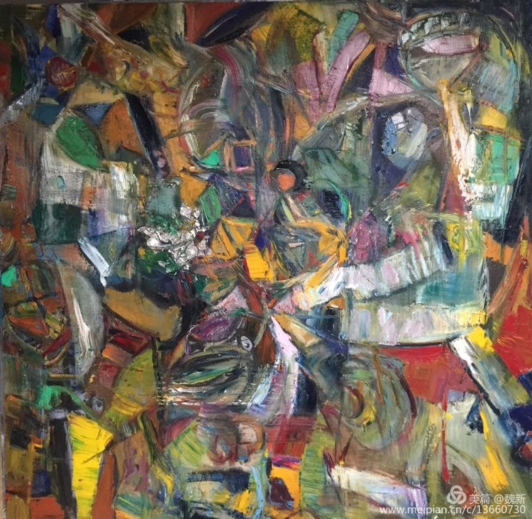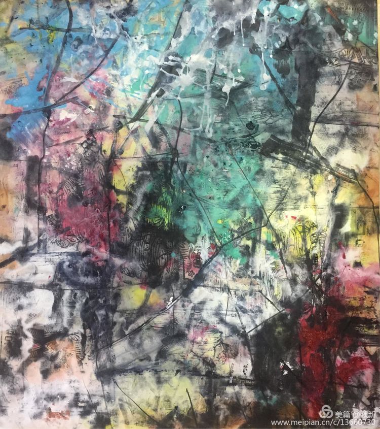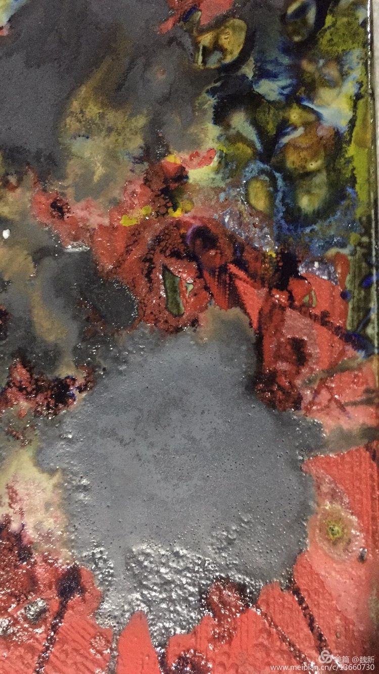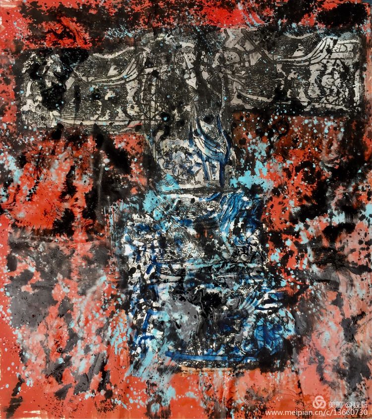 《跡象~楚夢(mèng)》重彩作者魏新。佳作!集"壯、奇、美"于一身,是楚文化最鼎盛時(shí)期的象征。用豐富的色彩、線條語言裝飾支持"楚夢(mèng)"的六大支柱:青銅冶鑄、髹漆工藝、絲織刺繡、美術(shù)音樂、老莊哲學(xué)、屈騷文學(xué)。詮釋其楚漢文化的神巫性、浪漫性,及卓然不屈精神的文化特征。