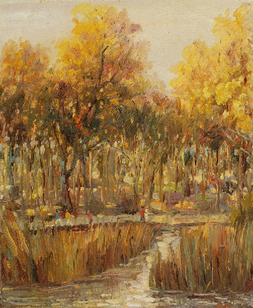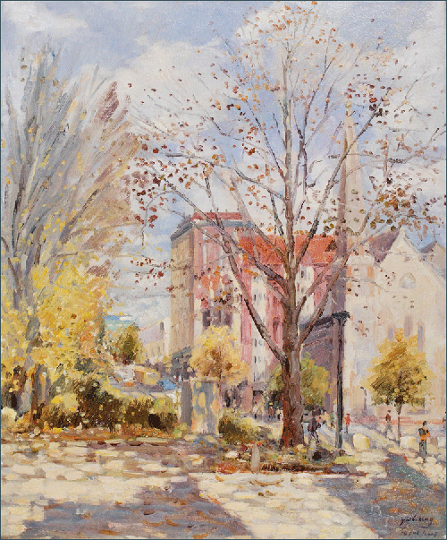 裕亮的油畫色彩明快,自由放松,注重在整體氣勢中講究層次的豐富和色調(diào)的微妙變化。像他的《維多利亞廣場的咖啡屋》《艾麗斯公園》《秋天的街道》等,這些作品沒有突兀的沖突,而是擅于運(yùn)用油彩的光色表現(xiàn),讓溫暖的陽光為周遭的景物涂上了一層奶黃的色彩。光感是裕亮風(fēng)景油畫的敘述語式,有了光感也就形成了空間;同樣,光影的運(yùn)用無疑也使他的油畫具有很強(qiáng)的空間幻覺感,使他的作品充滿了詩意。他從印象派出發(fā),善于捕捉大自然清新生動的第一感覺,認(rèn)真觀察沐浴在光線中的自然之景,尋求并把握色彩的冷暖變化和相互作用,以看似隨意實則準(zhǔn)確地抓住對象的迅捷手法,把變幻不拘的光色效果記錄在畫布上。但裕亮的油畫又不純粹摹仿印象,他善于在繪畫中注重對外光的研究和表現(xiàn),善于依據(jù)自己眼睛的觀察和現(xiàn)場的直感作畫,表現(xiàn)物象在光的照射下色彩的微妙變化,善于用點簇取代了傳統(tǒng)繪畫簡單的線與面,從而達(dá)到傳統(tǒng)繪畫所無法達(dá)到的對光的描繪。他的油畫有自己的審美品格。