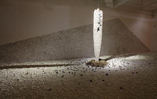 趙培生 葉落 500x1500cm 木、竹葉、陶瓷 2016