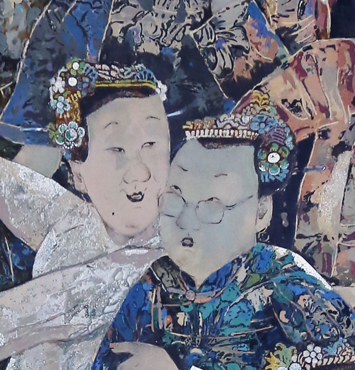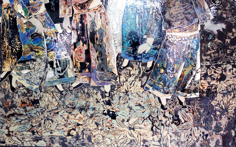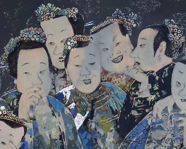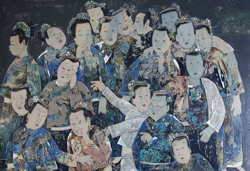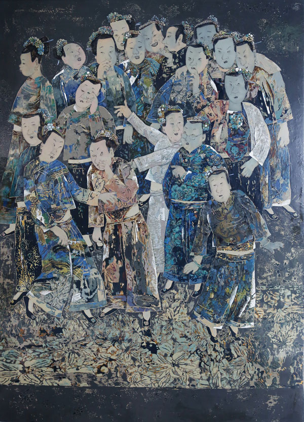 作品構(gòu)圖上呈團狀,強調(diào)畫面的形式感和凝聚力;色彩上吸收民間年畫、中國陶瓷的元素;造型上結(jié)合中國畫線的表現(xiàn)語言和民間剪紙的平面感。整張畫面?zhèn)鬟_出強烈的中國文化特點,這也是我們對漆畫藝術(shù)創(chuàng)作的一次大膽探索。