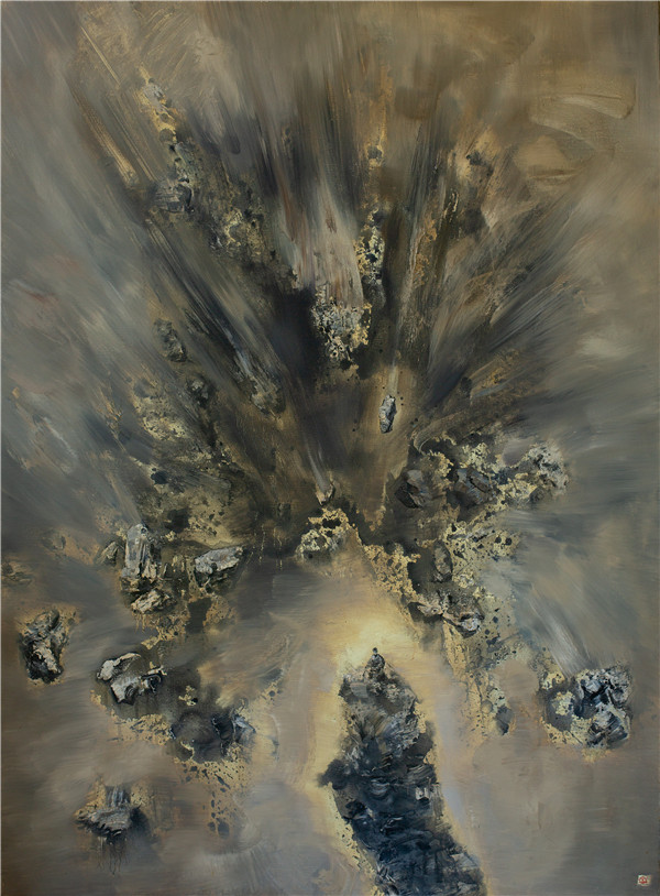 而從此展出的《飛石》系列作品是李江從2014年開始創(chuàng)作的,據(jù)李江介紹:“2014年左右我開始創(chuàng)作《飛石》系列作品,一直畫到現(xiàn)在。當(dāng)時想表現(xiàn)的是一些對“生命”的思考,‘災(zāi)難’似乎就在轉(zhuǎn)瞬之間……因為19歲時我的父親過世,讓我感受到人的命運世事無常。那年,我畫了一幅爆炸的場景,碎片到處飛,中間有鮮血流出,取名《瞬間》;2003年,在樂山親歷非典;2008年又遭遇了‘5.12’大地震,讓我越覺得人類隨時都在危險中?!臒o常讓人內(nèi)心充滿了恐懼和荒誕,就地球人類的生存狀況而言,都面臨著一種危機感?!蓖媸^多年,李江對石頭的理解也越來越深。李江表示,我沒畫石頭的表象,而是想表現(xiàn)石頭的硬度,有力量有陽剛的那種視覺張力。經(jīng)過幾年的實踐探索和視覺探討,我經(jīng)過多方面的閱讀和理解,也結(jié)合了中國傳統(tǒng)哲學(xué)“天人合一”的思想,在古代傳統(tǒng)中吸收營養(yǎng),做過多種探索實驗,畫面逐漸有了東方的韻味,我一直在表現(xiàn)“心中”的風(fēng)景。