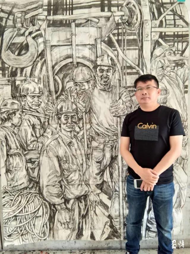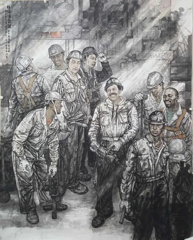 整幅畫面借助場面來展示,以龍門吊的底座機(jī)器為主、人物輔,人與物的交融來表達(dá)他的創(chuàng)作主題。他把機(jī)修工人的人物情緒刻畫得惟妙惟肖,整幅作品昂揚(yáng)著時代艱苦奮斗的精神。這幅作品修修改改多次,直至2017年吳淑清下半年才創(chuàng)作完成。此后,大輪胎背后的那故事、那些人一直縈繞在心頭,揮之不去。繼而又采用滿構(gòu)圖方式創(chuàng)作了《港內(nèi)急修二》。