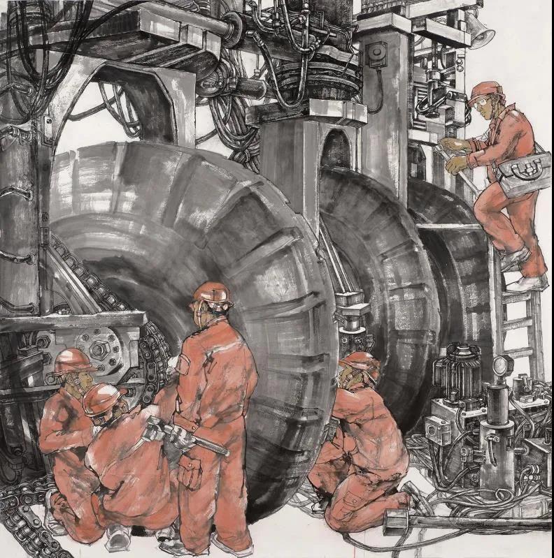 此時,有一臺出現(xiàn)故障,只見幾名機(jī)修工人,拎著工具箱。從遠(yuǎn)處紛紛趕來。那么大的機(jī)器輪胎,機(jī)修工人面前顯得那么的瘦小。蒼老的身軀,像是它生活的省略號,都在轟轟烈烈地滾動著它們一生。而面對那些機(jī)修工人何嘗不是如此。