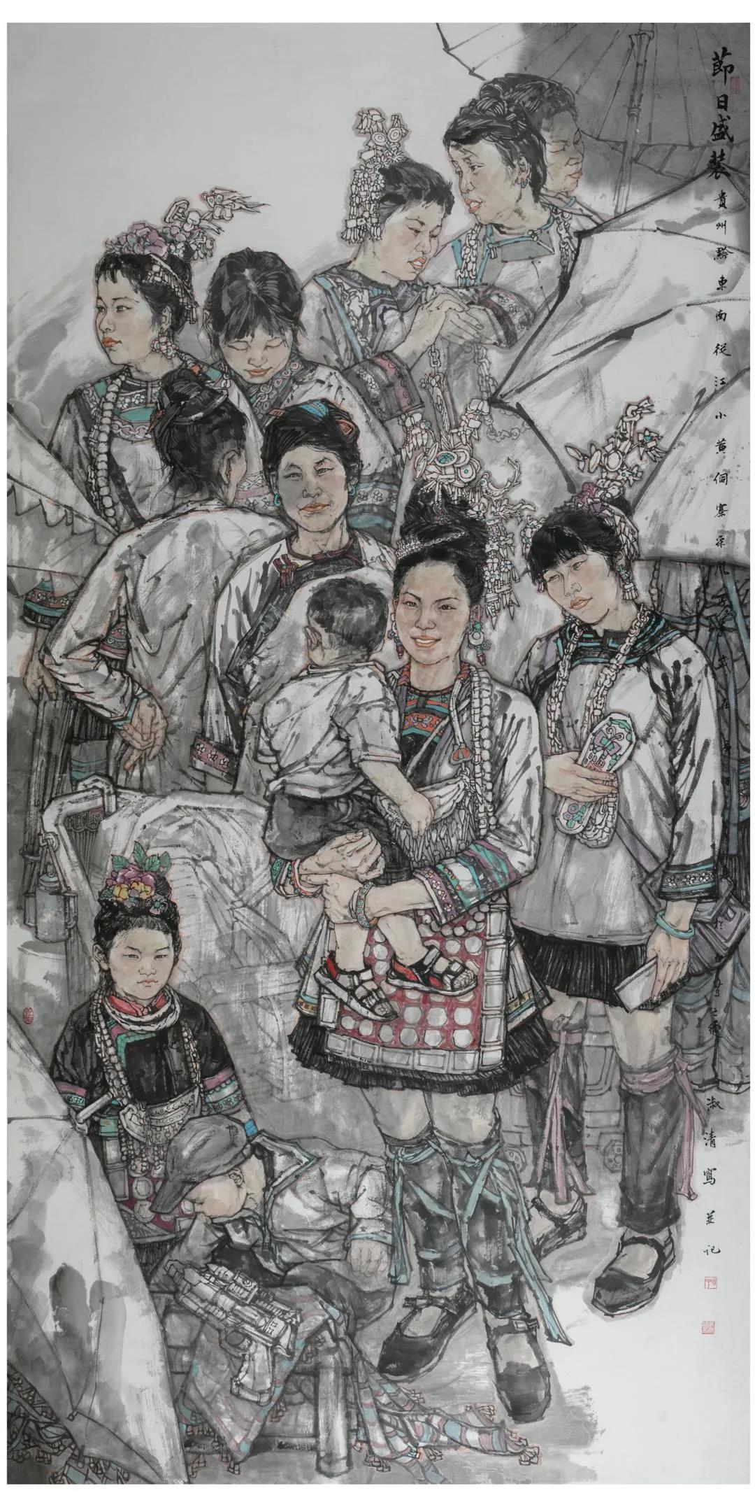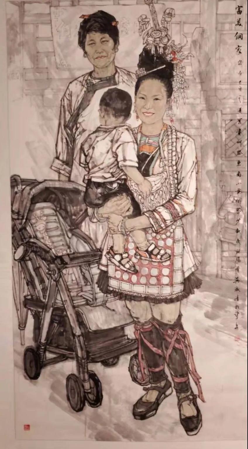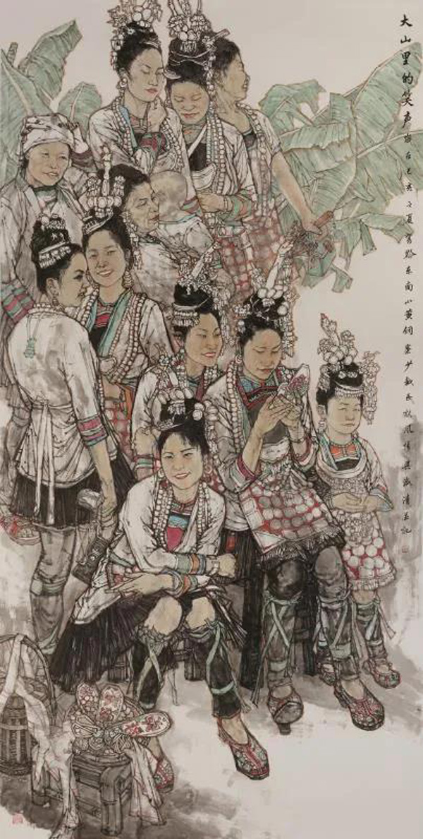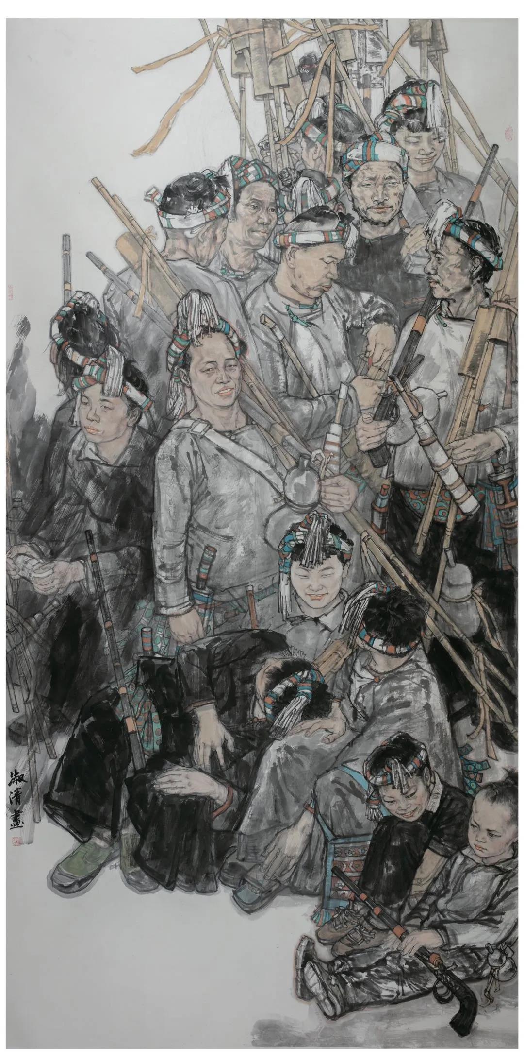 寨子的明月寨子的風(fēng),寨子的鼓樓,寨子的街,寨子里人們的歡聲笑語,無不在寄托了他夢回心靈故鄉(xiāng)的情愫。有時候,吳淑清,就是藝術(shù)棧道上的游子,注定著要漂泊,當(dāng)他累了乏了困惑了痛苦了,是這些撫慰了他,所以他的筆下才有了《大山里的笑聲》、巜岜沙苗寨?2018》、《絲綢之路情誼深》》等作品問世。