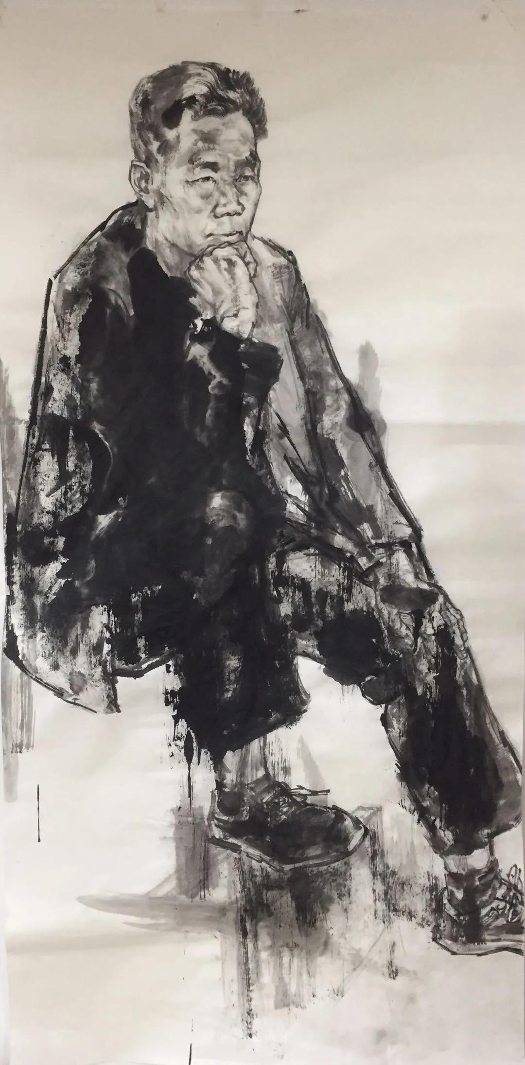 雖然他還剛開始,作品水墨線條有些凝滯不化,不夠大開大合。畫面中的線條有時候不夠嚴(yán)謹(jǐn)。若能讓線條剛勁有力,粗放渾厚又章法自露,用具有書法筆意的線條,紡織成變幻多姿的人物意象,我想他定能使畫面充滿質(zhì)感,顯得不輕挑,不浮躁。在這同時,對骨法用筆、墨分五色、力透紙背、剛?cè)嵯酀?jì)等筆墨要義的再多以探索追求,我相信假以時日,他定可以在水墨人物的探索中走得更遠(yuǎn)。