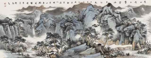 他的山水畫創(chuàng)作,屬于“大景山水”一格,介于工寫之間,屬于小青綠淺絳山水范疇。不論是宏篇巨制還是立軸斗方,都以意象雄偉的山石林木重重疊疊的組合,展示宏大與開闊的氣勢,而景物的鋪陳,多姿多彩,繁而不雜,多而不亂,營造出群峰逶迤、悠悠時空無限遼遠(yuǎn)的境界。所畫山體以筆見長,順勢皴擦,輔以水墨淡彩,層層積染,層層見筆,間或錯落變化,并具構(gòu)成意味。鄭輝煌憑借書法功底,畫面蘊含豐富,筆墨更趨精熟蒼勁。“以線立骨,與山傳神”的畫面并不依照傳統(tǒng)程式,也不分“南北宗”,而是取法自然,有虛有實,變化多端。其中有山巒起伏,有煙嵐浮動,有瀑泉直下,有林木葳蕤,于厚重沉雄中不失靈動,于宏闊幽遠(yuǎn)中饒有神韻,有樸茂散淡之古典意趣,更有蒼茫靈透的現(xiàn)代氣息,道盡了山水清音。