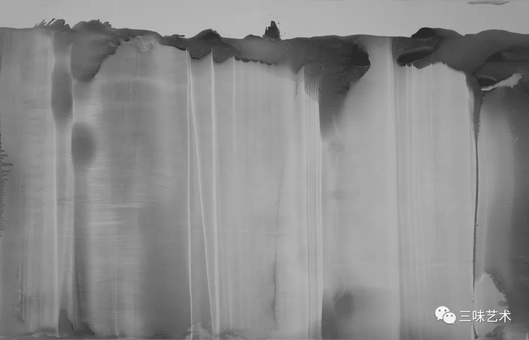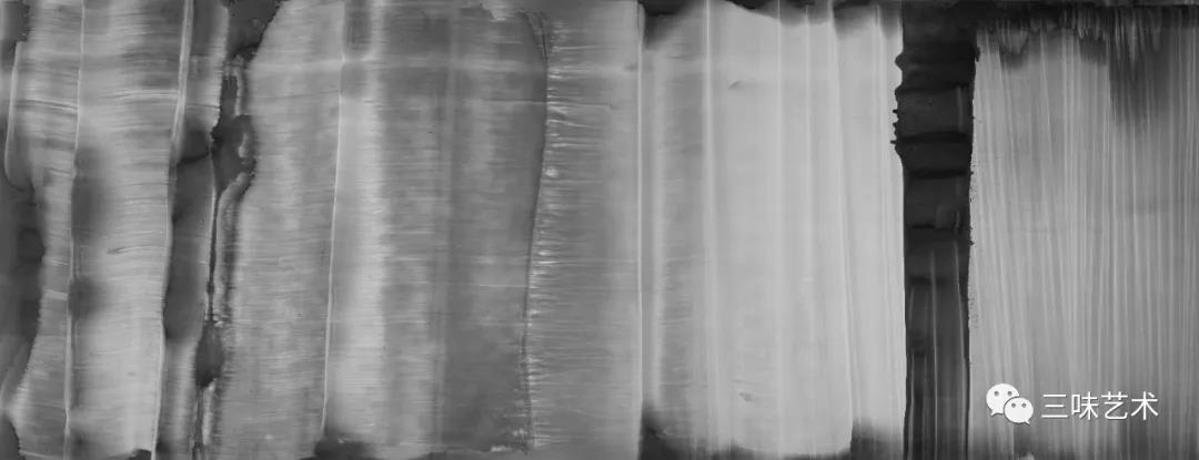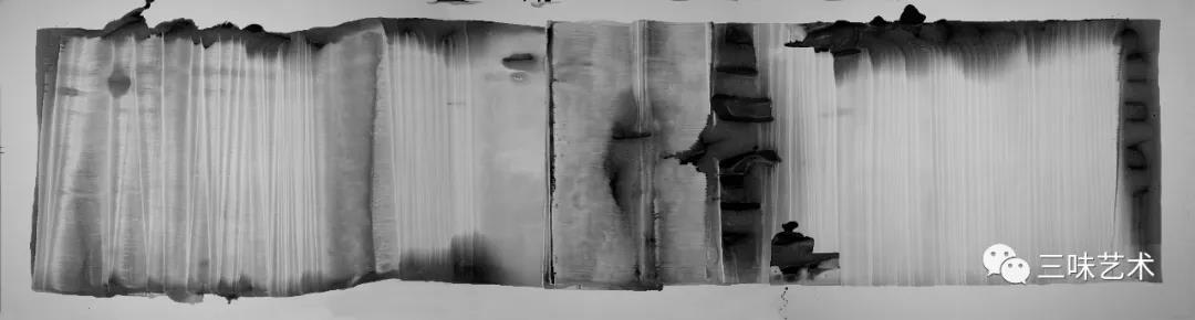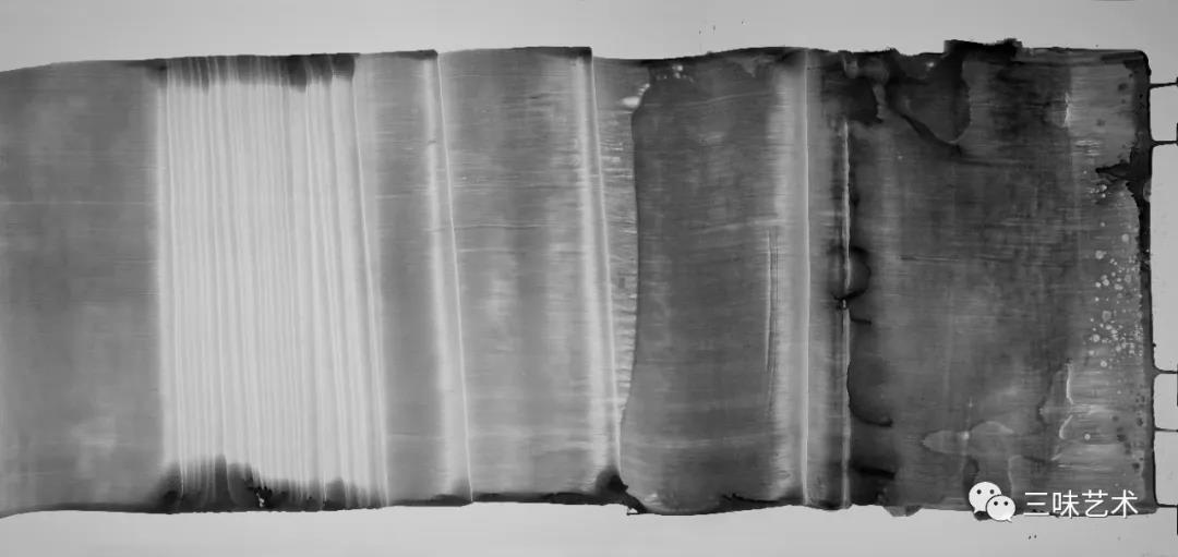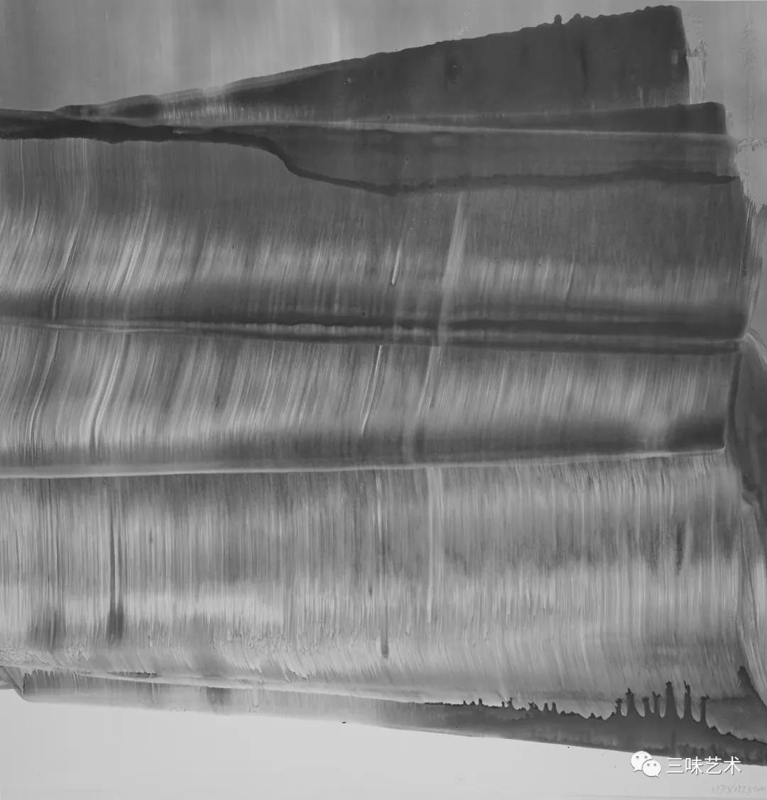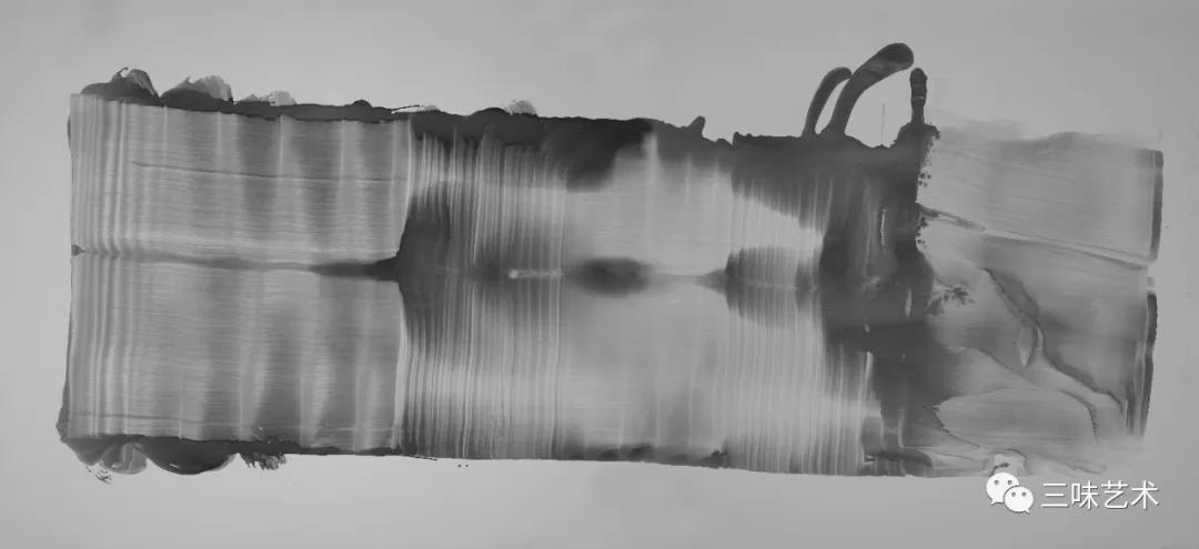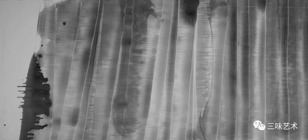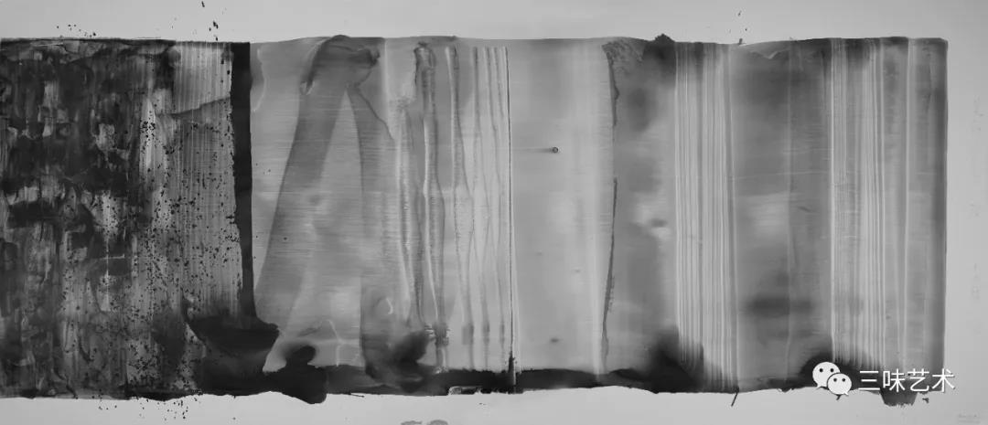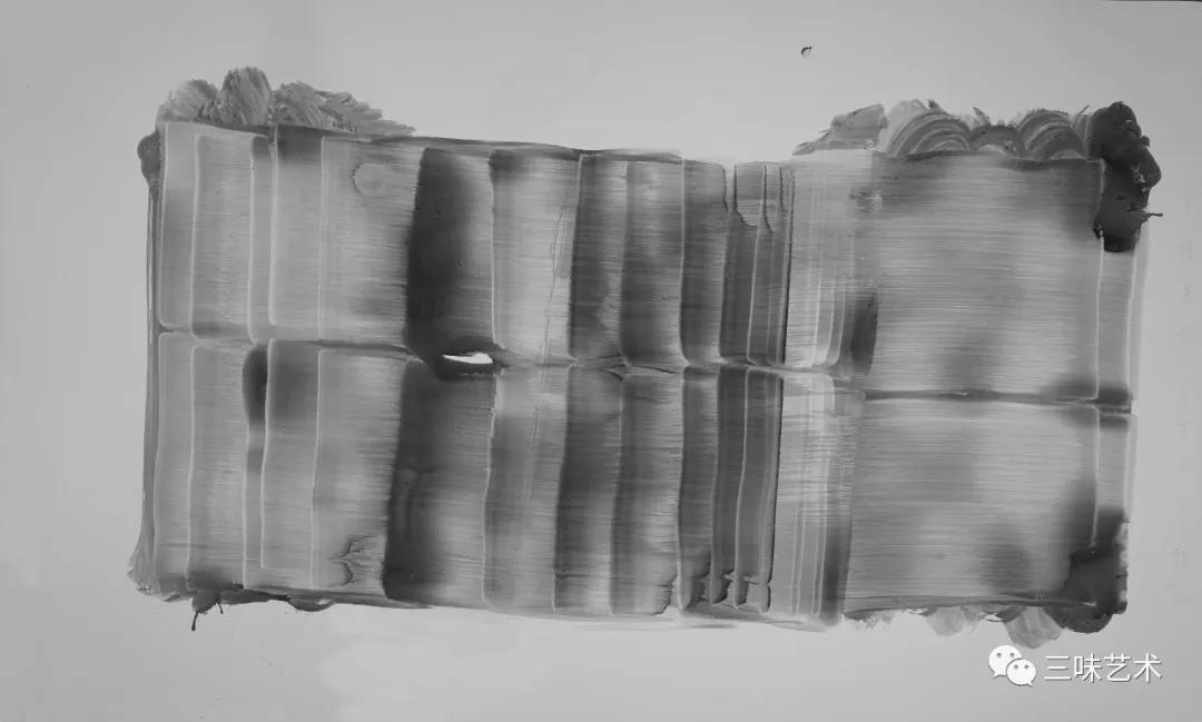 有意思的是,2011年以后,吳國全再次回到了自己創(chuàng)作的原初起點與邏輯關(guān)系之中。資料顯示,他此后既創(chuàng)作了《圖片水墨》系列,也創(chuàng)作了《硬質(zhì)水墨》系列;既創(chuàng)作了《砸墨》系列,也創(chuàng)作了《狂草水墨》系列。與他過去的水墨創(chuàng)作相比,很明顯的是,這些不同系列的作品已經(jīng)偏離了他先前的表現(xiàn)主義創(chuàng)作路線,并且是在往抽象表現(xiàn)的路子上轉(zhuǎn)。另外,吳國全在這些不同系列的思考方面其實有著很大區(qū)別,這也顯示出他想不斷摸索新創(chuàng)作方向,以獲得學(xué)術(shù)界與收藏界更大程度認(rèn)可的強烈愿望。比如,《圖片水墨》系列在強調(diào)“水墨思維與點、線、面、光的交響”時,意在突出現(xiàn)代影像與水墨表現(xiàn)的結(jié)合;(圖五,選發(fā)《圖片水墨》系列中的作品)《硬質(zhì)水墨》系列在使用新的材料——硬紙與排刷時,意在突出運墨過程中所形成的不同矩形圖式與肌理關(guān)系;(圖六,選發(fā)《硬質(zhì)水墨》系列中的作品)而《砸墨》系列則是將水墨表現(xiàn)與行為藝術(shù)結(jié)合了起來,其方法是將墨汁包好后再砸開,這也使得他能夠在大紙、大布、大墻、大地、大木板等媒介上隨意作畫,進而追求所謂“表達(dá)方式的革命”。(圖七,選發(fā)《砸墨》系列中的作品)不過,我對于后者,即《狂草水墨》系列更感興趣。因為其不但將傳統(tǒng)書法或水墨的元素融入了具有象征意味的抽象結(jié)構(gòu)之中,而且特別注意對瞬間暴發(fā)情感的表達(dá),結(jié)果便給人以完全不同于傳統(tǒng)書法與西方抽象畫的特殊感受。在國內(nèi)一些抽象水墨藝術(shù)家為了學(xué)習(xí)西方抽象藝術(shù)家的畫面圖式與表現(xiàn)手法,不惜消解筆墨表現(xiàn),轉(zhuǎn)而運用大潑大染大制作之手法的背景下,他的相關(guān)探索十分具有意義。(圖八,選發(fā)《狂草水墨》系列中的作品)
