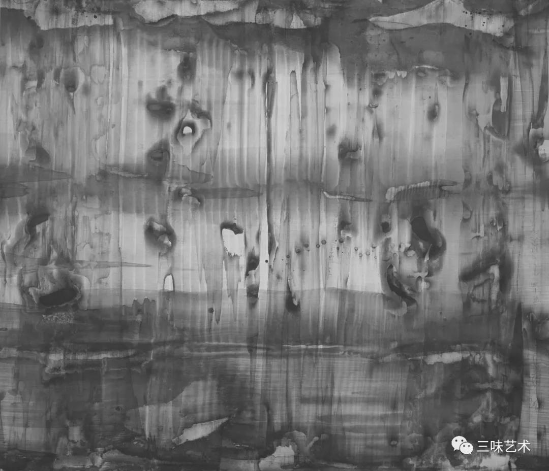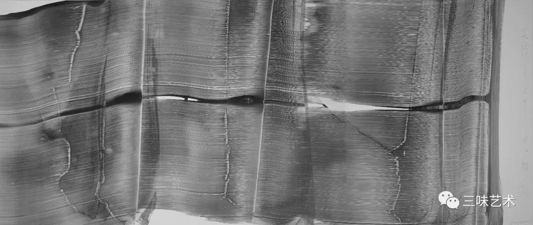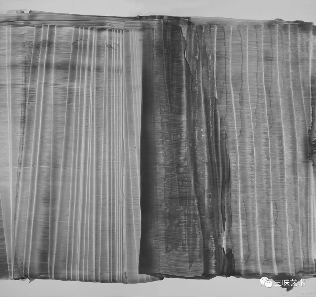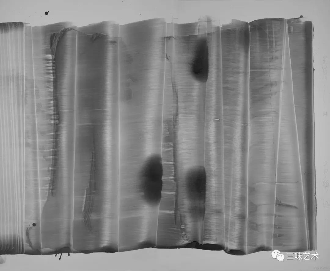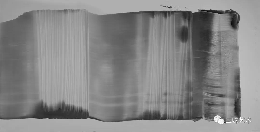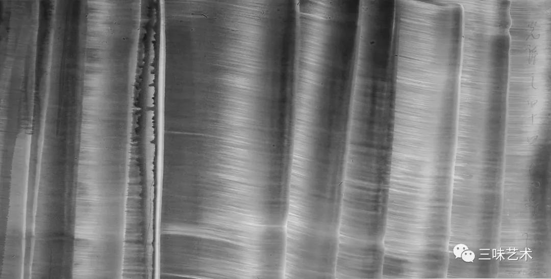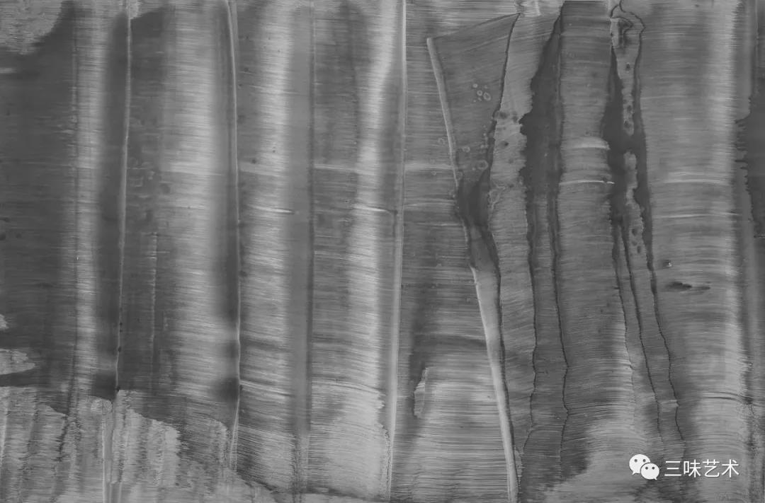有意思的是,2011年以后,吳國全再次回到了自己創(chuàng)作的原初起點與邏輯關(guān)系之中。資料顯示,他此后既創(chuàng)作了《圖片水墨》系列,也創(chuàng)作了《硬質(zhì)水墨》系列;既創(chuàng)作了《砸墨》系列,也創(chuàng)作了《狂草水墨》系列。與他過去的水墨創(chuàng)作相比,很明顯的是,這些不同系列的作品已經(jīng)偏離了他先前的表現(xiàn)主義創(chuàng)作路線,并且是在往抽象表現(xiàn)的路子上轉(zhuǎn)。另外,吳國全在這些不同系列的思考方面其實有著很大區(qū)別,這也顯示出他想不斷摸索新創(chuàng)作方向,以獲得學(xué)術(shù)界與收藏界更大程度認(rèn)可的強烈愿望。比如,《圖片水墨》系列在強調(diào)“水墨思維與點、線、面、光的交響”時,意在突出現(xiàn)代影像與水墨表現(xiàn)的結(jié)合;(圖五,選發(fā)《圖片水墨》系列中的作品)《硬質(zhì)水墨》系列在使用新的材料——硬紙與排刷時,意在突出運墨過程中所形成的不同矩形圖式與肌理關(guān)系;(圖六,選發(fā)《硬質(zhì)水墨》系列中的作品)而《砸墨》系列則是將水墨表現(xiàn)與行為藝術(shù)結(jié)合了起來,其方法是將墨汁包好后再砸開,這也使得他能夠在大紙、大布、大墻、大地、大木板等媒介上隨意作畫,進而追求所謂“表達(dá)方式的革命”。(圖七,選發(fā)《砸墨》系列中的作品)不過,我對于后者,即《狂草水墨》系列更感興趣。因為其不但將傳統(tǒng)書法或水墨的元素融入了具有象征意味的抽象結(jié)構(gòu)之中,而且特別注意對瞬間暴發(fā)情感的表達(dá),結(jié)果便給人以完全不同于傳統(tǒng)書法與西方抽象畫的特殊感受。在國內(nèi)一些抽象水墨藝術(shù)家為了學(xué)習(xí)西方抽象藝術(shù)家的畫面圖式與表現(xiàn)手法,不惜消解筆墨表現(xiàn),轉(zhuǎn)而運用大潑大染大制作之手法的背景下,他的相關(guān)探索十分具有意義。(圖八,選發(fā)《狂草水墨》系列中的作品)
