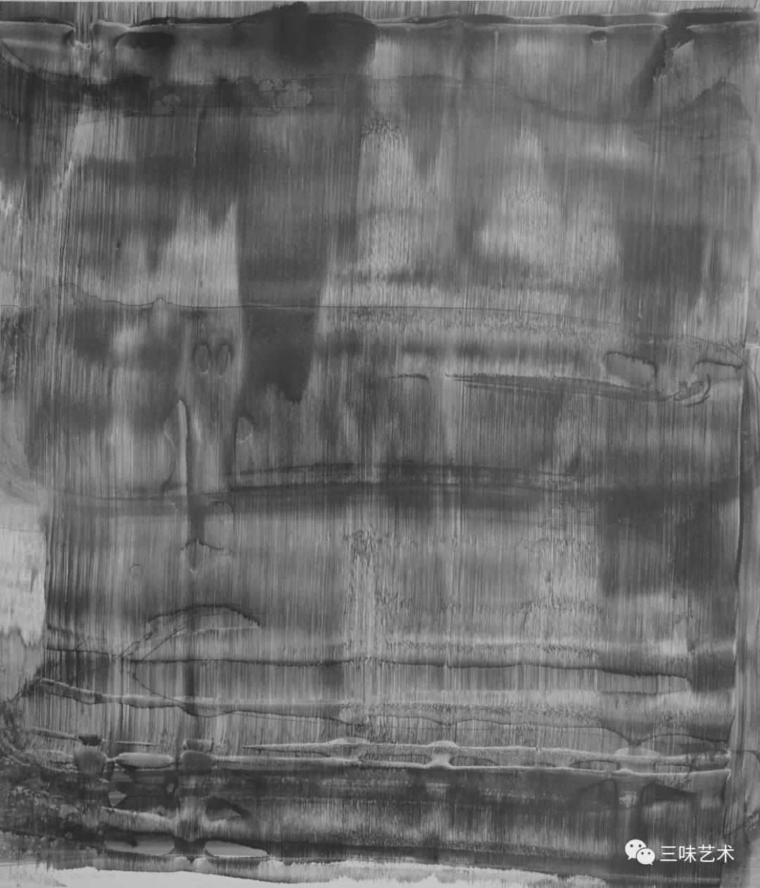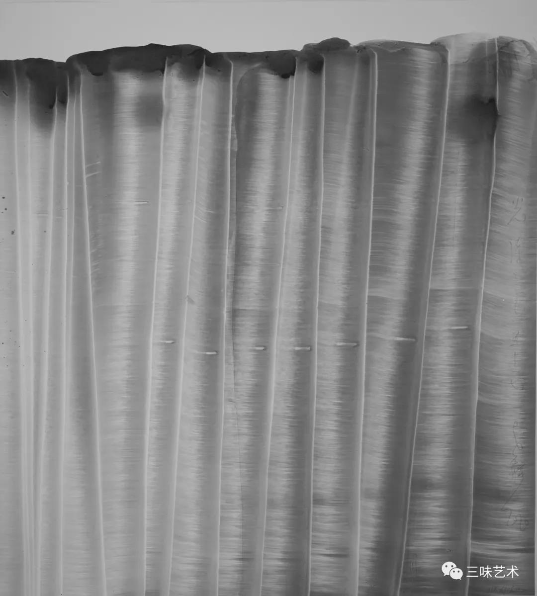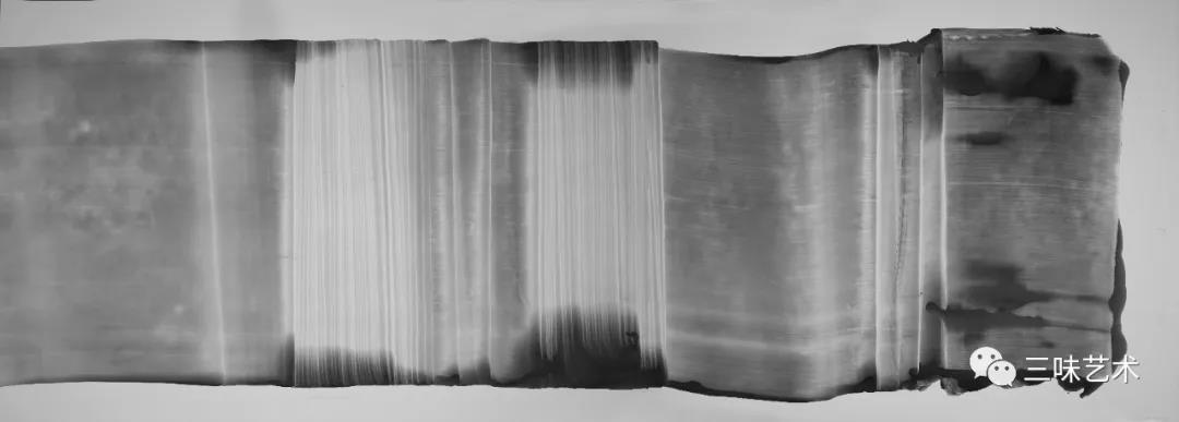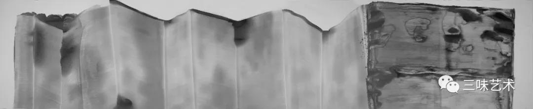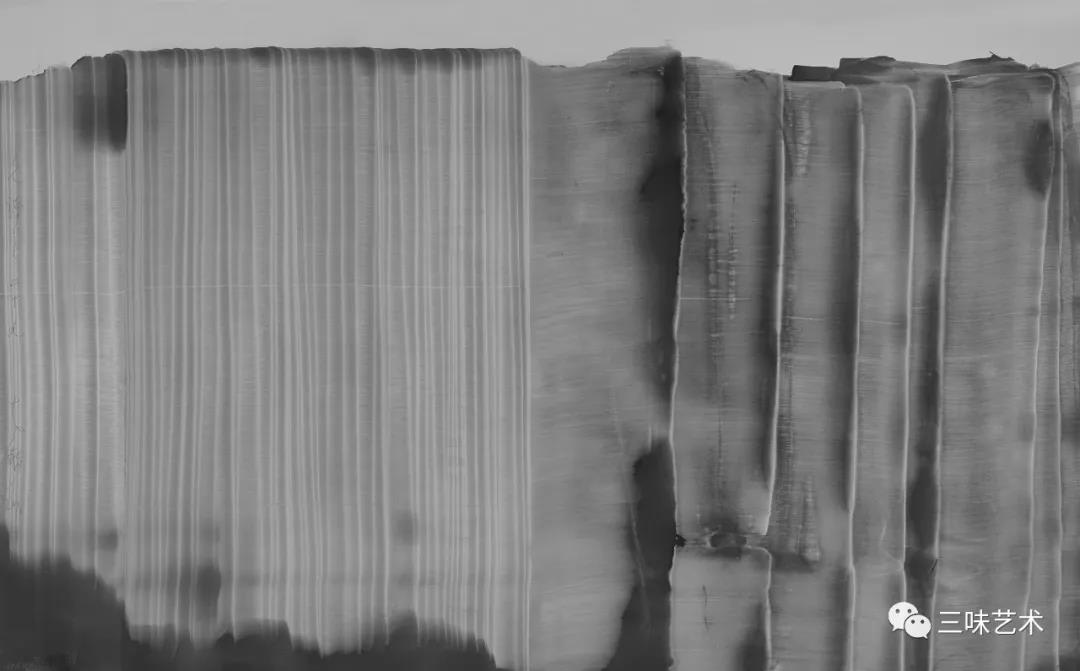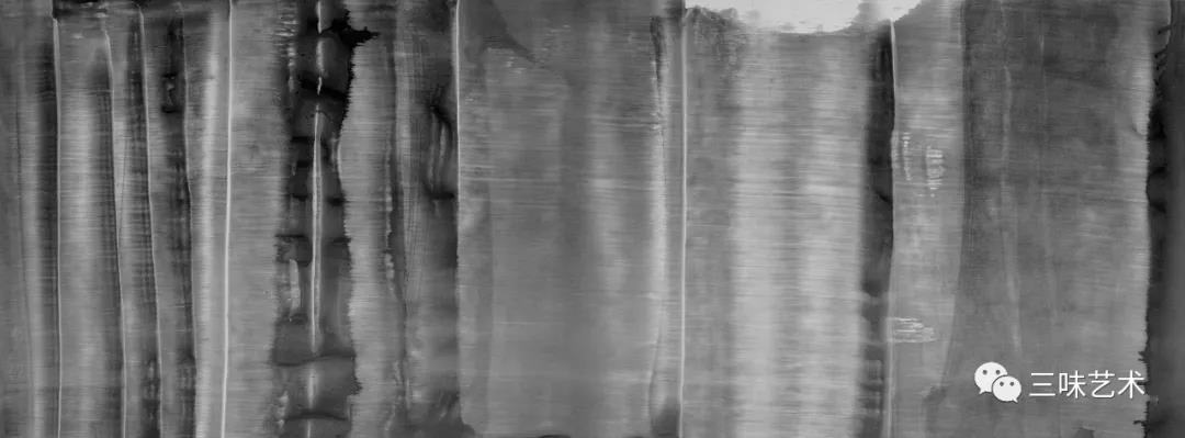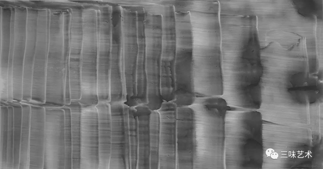 有意思的是,2011年以后,吳國全再次回到了自己創(chuàng)作的原初起點與邏輯關(guān)系之中。資料顯示,他此后既創(chuàng)作了《圖片水墨》系列,也創(chuàng)作了《硬質(zhì)水墨》系列;既創(chuàng)作了《砸墨》系列,也創(chuàng)作了《狂草水墨》系列。與他過去的水墨創(chuàng)作相比,很明顯的是,這些不同系列的作品已經(jīng)偏離了他先前的表現(xiàn)主義創(chuàng)作路線,并且是在往抽象表現(xiàn)的路子上轉(zhuǎn)。另外,吳國全在這些不同系列的思考方面其實有著很大區(qū)別,這也顯示出他想不斷摸索新創(chuàng)作方向,以獲得學(xué)術(shù)界與收藏界更大程度認(rèn)可的強烈愿望。比如,《圖片水墨》系列在強調(diào)“水墨思維與點、線、面、光的交響”時,意在突出現(xiàn)代影像與水墨表現(xiàn)的結(jié)合;(圖五,選發(fā)《圖片水墨》系列中的作品)《硬質(zhì)水墨》系列在使用新的材料——硬紙與排刷時,意在突出運墨過程中所形成的不同矩形圖式與肌理關(guān)系;(圖六,選發(fā)《硬質(zhì)水墨》系列中的作品)而《砸墨》系列則是將水墨表現(xiàn)與行為藝術(shù)結(jié)合了起來,其方法是將墨汁包好后再砸開,這也使得他能夠在大紙、大布、大墻、大地、大木板等媒介上隨意作畫,進而追求所謂“表達(dá)方式的革命”。(圖七,選發(fā)《砸墨》系列中的作品)不過,我對于后者,即《狂草水墨》系列更感興趣。因為其不但將傳統(tǒng)書法或水墨的元素融入了具有象征意味的抽象結(jié)構(gòu)之中,而且特別注意對瞬間暴發(fā)情感的表達(dá),結(jié)果便給人以完全不同于傳統(tǒng)書法與西方抽象畫的特殊感受。在國內(nèi)一些抽象水墨藝術(shù)家為了學(xué)習(xí)西方抽象藝術(shù)家的畫面圖式與表現(xiàn)手法,不惜消解筆墨表現(xiàn),轉(zhuǎn)而運用大潑大染大制作之手法的背景下,他的相關(guān)探索十分具有意義。(圖八,選發(fā)《狂草水墨》系列中的作品)