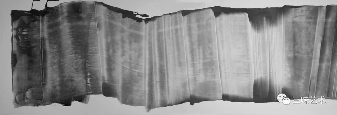 正如大家所見,吳國全的《狂草水墨》系列在構(gòu)圖上除用了少量條幅的方式外,更多是采取橫卷的方式。而那以粗重筆墨處理的畫面,常常給人以沉甸甸的感覺,既表達(dá)了藝術(shù)家馳騁的心理,也充滿著自由的襟懷。而在具體的創(chuàng)作過程中,他首先是大膽地將種種漢字字符打散后作為整體空間的基本素材予以自由化處理;其次是對于線條的表現(xiàn)特別用心,我注意到,他雖然更多是以行草書般的筆意處理畫面,但有時卻會以隸書般的筆意,有時又會以篆書般的筆意進行表現(xiàn)。與此同時,他特別強調(diào)純粹的線條美、筆勢美、造型美、墨韻美、構(gòu)成美;再其次,他還會有意用筆墨的盤旋往復(fù)、重疊交錯、濃淡變化、干濕對比、粗細(xì)處理等不同方式安排畫面的空間關(guān)系與章法構(gòu)成,結(jié)果就造成了一種音樂般的和聲效果。有一點必須提及,即他還特別注意水墨畫那一次性完成或不可修改的特點。而這既使他的作品氣貫筆端,氣息悠長,也使其明顯突現(xiàn)出順序感與時間感,相信但凡受過相關(guān)訓(xùn)練的的觀眾通過作品中那筆的重疊、承接與墨色變化,將不難體會到藝術(shù)家在創(chuàng)作時的用筆過程。從藝術(shù)史的角度看,這種做法非常重要。事實上,美國抽象表現(xiàn)藝術(shù)家托比就從中國傳統(tǒng)書法強調(diào)時間因素的做法中,成功地發(fā)展出了“自動繪畫”的概念。?這一藝術(shù)概念重視直覺與偶然因素的作用,追求繪畫的自然生長過程。其對后來出現(xiàn)的波洛克等人有重大的影響。當(dāng)然,如果以世界藝術(shù)史為線索,我們還會發(fā)現(xiàn):吳國全在很大程度上,已經(jīng)巧妙地將西方現(xiàn)代藝術(shù)——主要是抽象主義,還有表現(xiàn)主義、立體主義藝術(shù)的若干特點,如對造型性的追求、對表現(xiàn)至上的追求、對平面構(gòu)成的追求很自然地融入其中。由是,他的《狂草水墨》系列作品與傳統(tǒng)藝術(shù)也形成了若即若離的關(guān)系。打個不太恰當(dāng)?shù)谋扔靼?,這兩者就像父子關(guān)系一樣。兒子雖然與父親有著血緣上的關(guān)系,但決不是父親本身,他就是他自己,更有著自己的特點。吳國全給我們的深刻啟示是:在推進傳統(tǒng)水墨向現(xiàn)代水墨轉(zhuǎn)換的歷史進程中,一定要超越東西方二元對立的價值模式。即一方面要大膽學(xué)習(xí)西方藝術(shù)中有價值的東西;另一方面還要努力從傳統(tǒng)藝術(shù)中尋求具有現(xiàn)代因素的東西。但這一切只有在多元文化的碰撞與交融中才可以做到。與此相反,頑固堅守單一的、原生態(tài)的民族價值觀念的做法,或者是盲目模仿西方現(xiàn)代藝術(shù)的做法,都是斷不可取的。