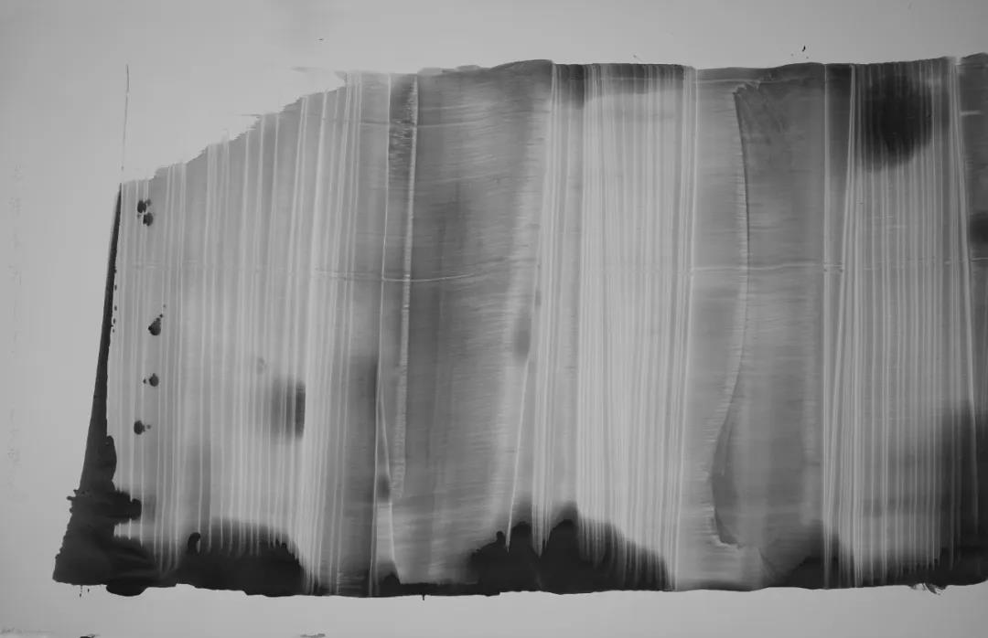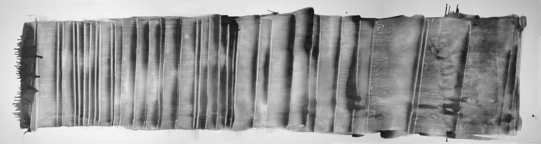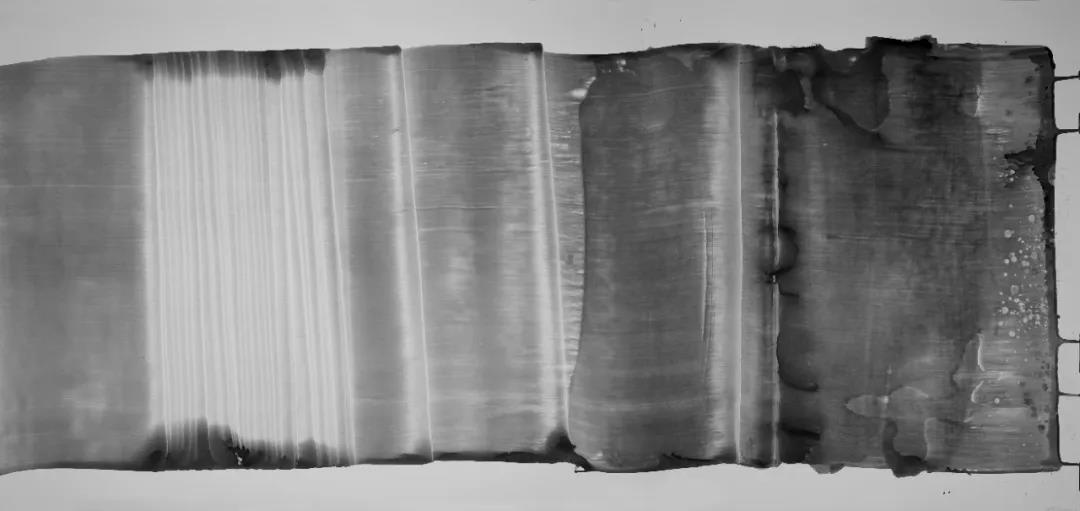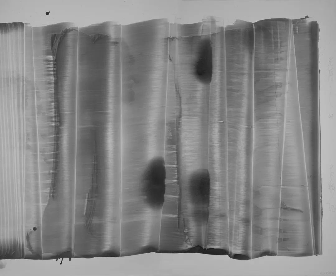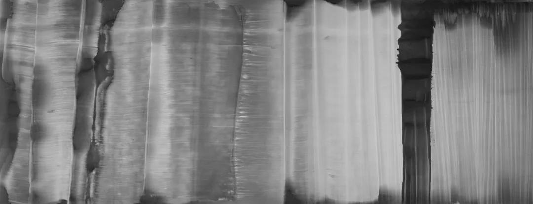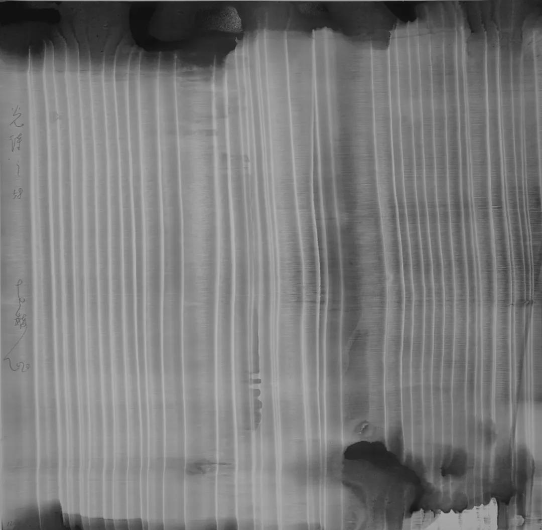 因?yàn)檫@是穿越了生死的光絲之思語,光絲的波動(dòng),帶有其充沛飽滿的內(nèi)在氣息與能量,形成內(nèi)在的張力,這是面對(duì)過生死時(shí)刻的洗禮與沖刷,甚至攜帶著病毒泛濫的恐懼,但又有著對(duì)于死者的沉默哀悼,繪畫成為“哀思”的行動(dòng),隱約的墨痕暗示生命的虛無化。