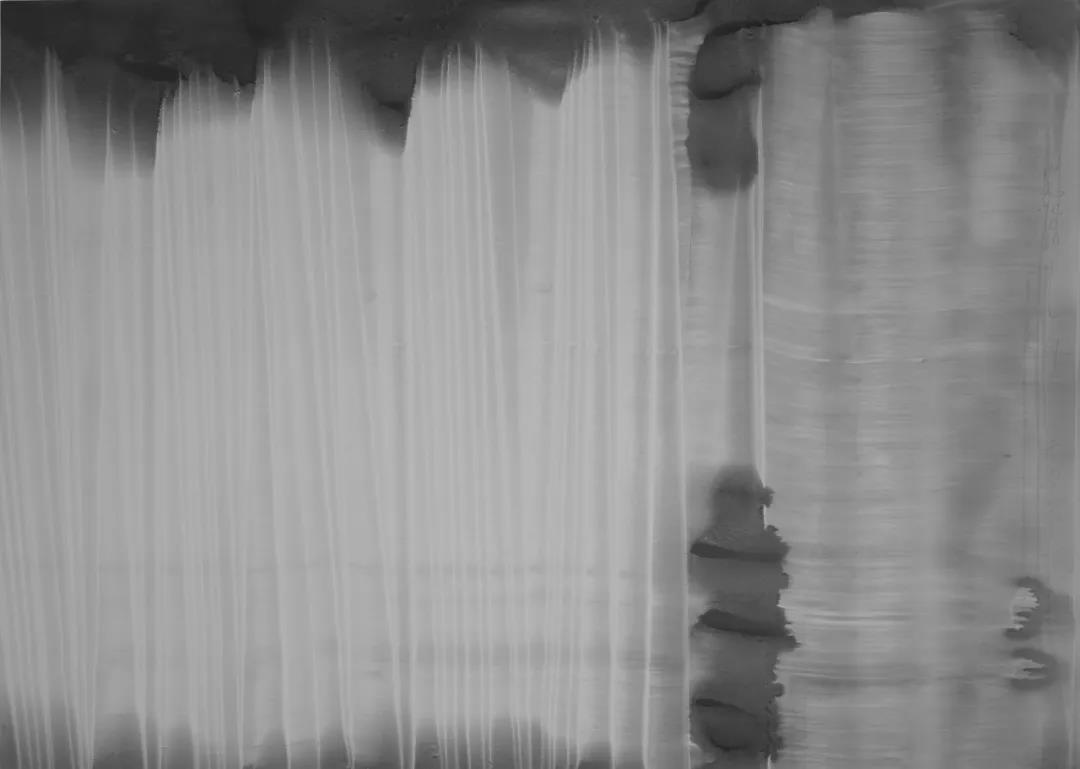 以此多重的光語所激發(fā)出的光譜,在畫面形成一套美麗的面紗,如同春季紗窗上的陽(yáng)光,如同秋日窗簾的私語,如同玻璃的詩(shī)意反光,但都被藝術(shù)家以水氣墨氣的滲透,在急速的書寫中,利用書法的屋漏痕與飛白的急澀感,留下細(xì)微的折痕,以水性氣化的微暈來化解白光的強(qiáng)力,使之更為柔和,如同一層“薄紗”,不允許穿透,不允許破壞,只能深情關(guān)注,只能輕輕撫愛。