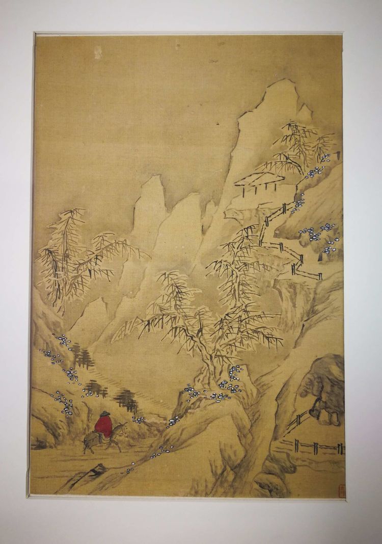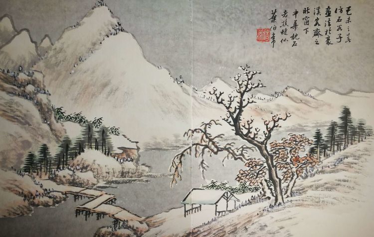 冬圖是我的最愛(ài)了。畫(huà)家將現(xiàn)實(shí)視覺(jué)感和虛幻的理念結(jié)合起來(lái):淡墨渲染下的雪山,寒意襲人啊。一遠(yuǎn)行的人騎驢而至,孤寂地行走在峽谷深壑的驛站中,紅色的衣衫既點(diǎn)出行者的個(gè)性,又與山道旁白色粉點(diǎn)下的山坡和層層漬染的樹(shù)石積雪相映成趣,簡(jiǎn)約冷峻,奇峭清潤(rùn)似有黃公望山水的遺風(fēng)。這可是生活在動(dòng)蕩的社會(huì)環(huán)境中的古典文人,失落的情懷,在“超世”和“戀世”的矛盾中,內(nèi)心情感的自然流露! 文/王璧
