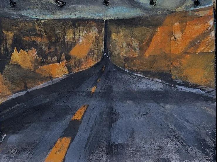 陳明華告訴我,用刮刀把混合膠水的顏料在紙上反復刮,刮來刮去,作畫是一個不斷運動的過程。材料媒介作用大于繪制功夫,很多感覺很難用筆畫出來,刮刀在他的運作下是一把很大的筆,能繪出普通筆畫不出來的效果。