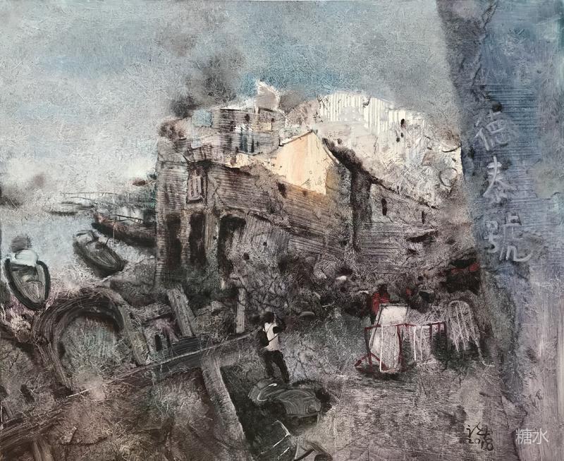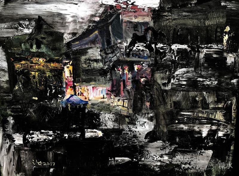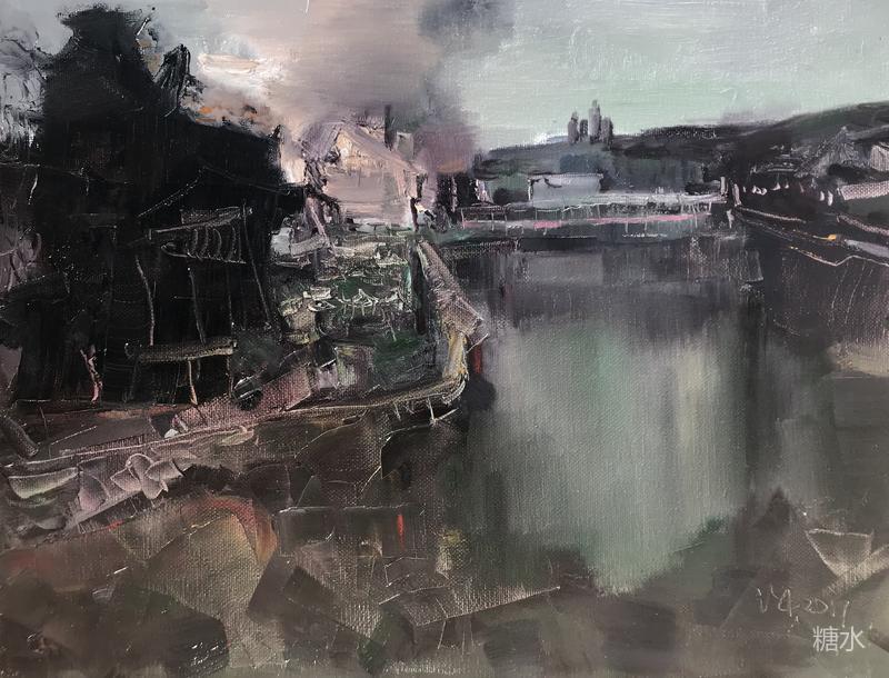 我想這就是畫家的深意所在,因為成都的年齡決定了它的豐饒內(nèi)蘊,你畫出任何一件具象的東西,都立刻會有遺落其它東西的遺憾,與其掛一漏萬,不如混沌包容。一即萬,萬即一,有無相生,虛實互滲,于是畫上的成都就是現(xiàn)實中真實的成都,它神秘但有輪廓,朦朧然而有精骨,畫上的成都擔當?shù)闷鹫鎸嵉某啥嫉呢S富內(nèi)涵,因為古往今來的成都就是活生生的,是原生的又是變化無窮的,它有呼吸有成長有情致,時刻都是它又時刻不是它,畫家為了讓它不固化于某一刻而永遠有生機,于是呈現(xiàn)出眼前這種間離的效果。