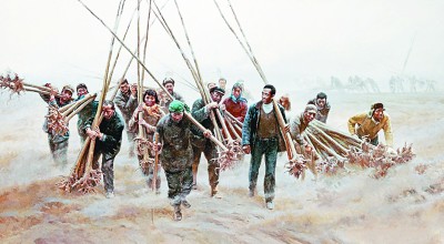 金燦燦的橙子、滿載貨物的卡車、忙著掃描快遞單的送貨員、操作電腦的年輕人、滿臉笑容的村民……這些鮮活的元素共同構建起油畫《互聯網的春天——農村電商》。近年來,隨著電子商務在中國的發(fā)展,浙江、廣東、江蘇等地涌現出許多“淘寶村”。這些依靠互聯網將特產、手工藝品銷往全國各地,實現脫貧致富的“淘寶村”甚至“淘寶鎮(zhèn)”,無疑是新時代脫貧攻堅的典型案例。為了表現好“互聯網+農村”的主題,藝術家郭健濂、褚朱炯深入考察了浙江的許多村落。創(chuàng)作時,畫家重點表現了物流網點、快遞卡車、筆記本電腦等元素,讓觀者第一眼就能感受到新時代農村物流網與傳統(tǒng)農貿市場的區(qū)別?!斑^去在城市要吃到新鮮的水果就得去菜市場,現在通過電商平臺,只用在家動動手指就能直接在果農那里買到最優(yōu)質的鮮果,真是科技改變生活?!币幻^眾在作品前發(fā)出感慨。