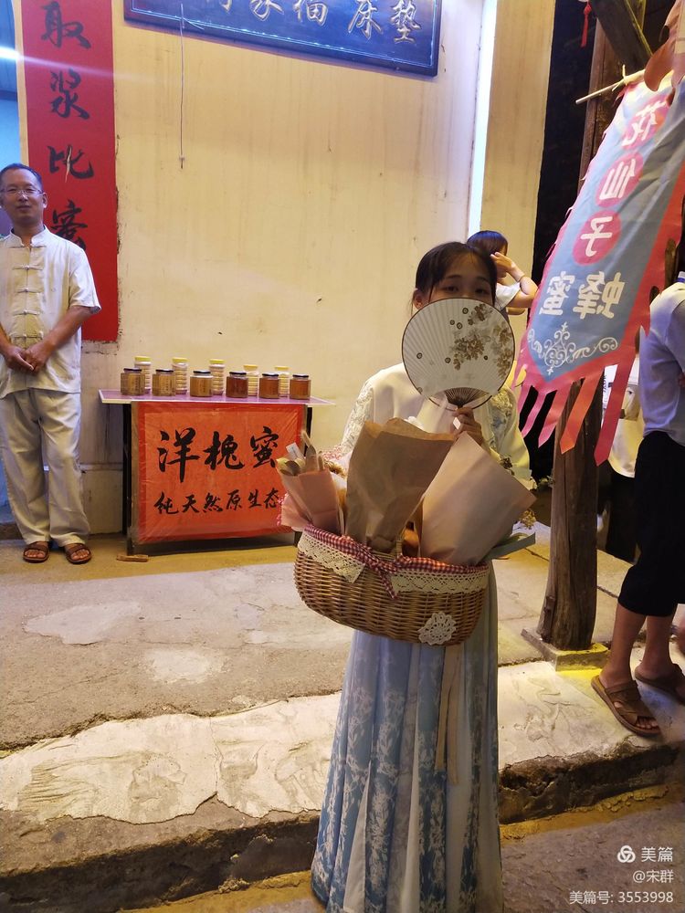 這兒有賣糖水的,像蔬果店鋪,那里總會圍著一群嘰嘰喳喳身著盛裝的孩子們,等一杯心儀的甜品到手之后,他們便踏著星光,拋下一串銀鈴般的笑聲跑遠了,披在他們身上的,分不清是燈光還是星光。 站在穿著漂亮漢服的人們中間,有一種恍若夢境的穿越之感。