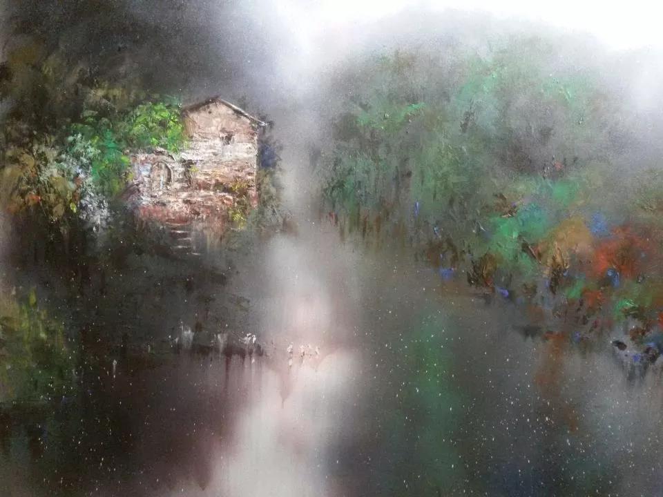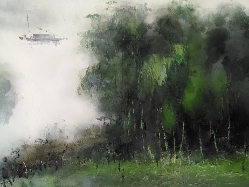 在創(chuàng)作上,余劍鋒很好的理解到了這一點(diǎn)。基于油畫的物質(zhì)基礎(chǔ)之上,利用獨(dú)有的技法打破了傳統(tǒng)西方繪畫嚴(yán)謹(jǐn)?shù)臉?gòu)圖法則、光影法則與色彩法則,進(jìn)而營造出了兼具婉約與豪放,惋嘆與蒼茫,真實(shí)與縹緲的東方意韻。