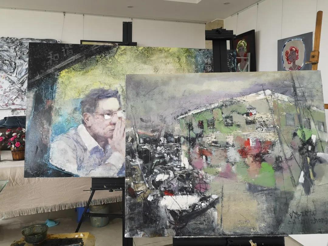 工業(yè)區(qū)的繪畫工作室別具一番風(fēng)味,冷冽的“工業(yè)風(fēng)”與心中臆想中“藝術(shù)風(fēng)”相去甚遠(yuǎn),卻也不及踏進(jìn)崔老師工作室時(shí),滿墻滿地的油畫所帶來的視覺沖擊。身處此地,感受著畫中物在崔老師的筆下,演繹著情感與靈魂,散發(fā)著別具一格的當(dāng)代氣息,每一幅作品的畫面都造型個(gè)性鮮明,色彩或濃郁或恬淡。