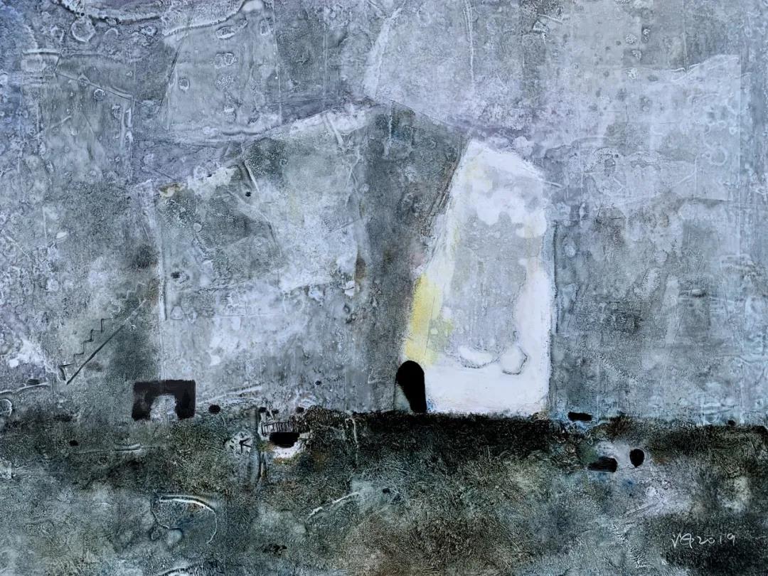 崔治中老師筆下的長城垛樓、望口、石階、石縫,折射出一個(gè)時(shí)代一個(gè)民族在歲月沖洗中的輝煌、滄桑、風(fēng)化、褪色、衰變。畫面的反復(fù)鋪陳和抽象表達(dá),并注入他對(duì)歷史的理解、符號(hào)式地加入嬰兒車、三角形臺(tái)梯、光亮的泉眼、流動(dòng)的飛云、奔騰的駿馬,特別是與靜態(tài)固定的城墻形成反差的船只和波濤洶涌的大海。其象征意義是從宏大的中西文化視野中,反觀文明的歷史殘存,試圖用畫筆啟發(fā)人們思考“面對(duì)現(xiàn)代文明進(jìn)程我們的心靈該如何安放”這一具有哲學(xué)和現(xiàn)實(shí)雙重意義的問題。