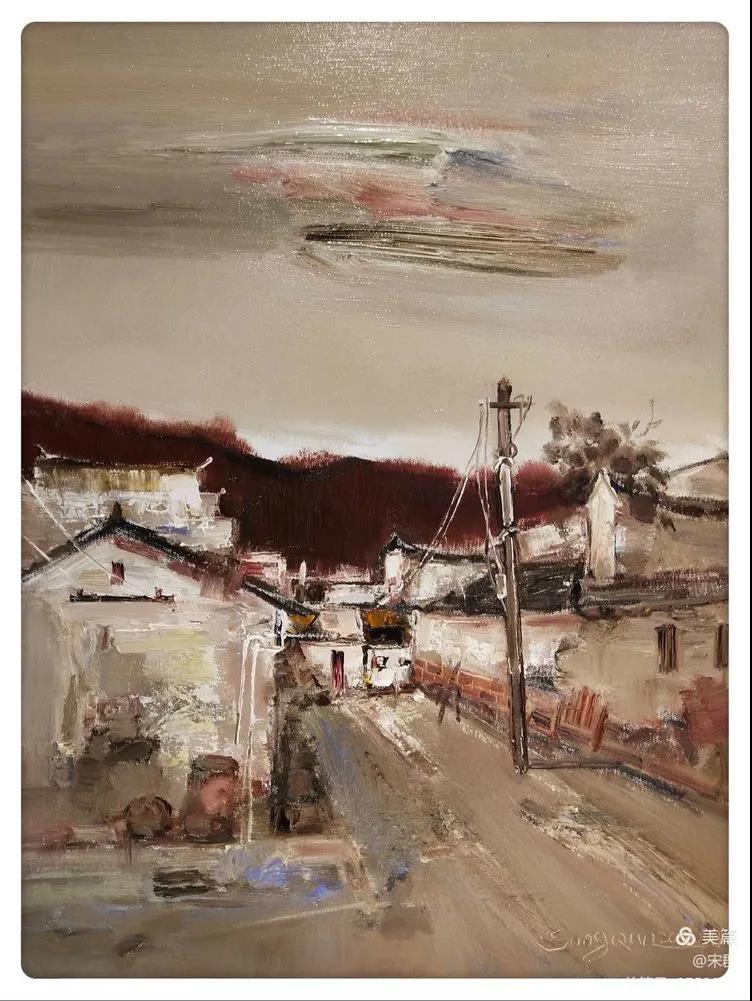 詩人眼中的秋是傷感的,而畫家眼里的秋是彩色的。秋天是畫家們最鐘愛的季節(jié)了,我們以山色的變化為令,邀上一群好友走出家門,走進(jìn)山間,走入鄉(xiāng)野,用飽和的色彩和獨特的表達(dá)方式迎秋入懷。支開畫箱,手中的畫筆就可以開始發(fā)揮它們的作用了。好看的扇形筆仿佛是銀杏樹的葉子,可以靈活的用暖色起稿,點線面它都可以做到。無聲的板刷可派上了大用場,用它畫秋的天空與地面是最合適不過了。小巧的平頭筆,似乎很努力的想要把每一片秋葉,都表現(xiàn)在畫布上,可它發(fā)現(xiàn)這是徒勞,因為它根本數(shù)不清到底有多少片燦爛的葉子。至于那些開在枝頭的花兒,就交給蜜蜂去數(shù)吧;天空中盛開的云朵,就交給風(fēng)兒去寵愛吧;所有的山巒、村舍、樹木,彎曲的小路,以及田間勞作的人們,就交給我手中的畫筆,有選擇的去表現(xiàn)吧。潔白的雨露麻上,我用色彩勾勒著它們的情態(tài),流動的筆觸,似有樂音溜進(jìn)彩色的風(fēng)里。