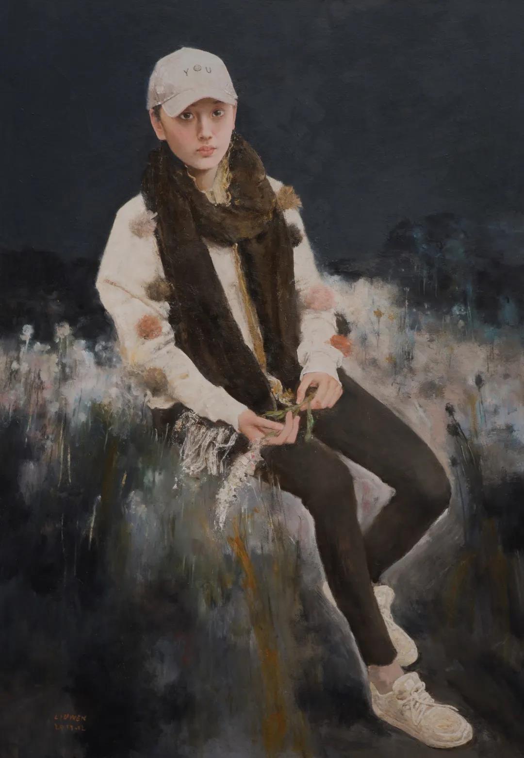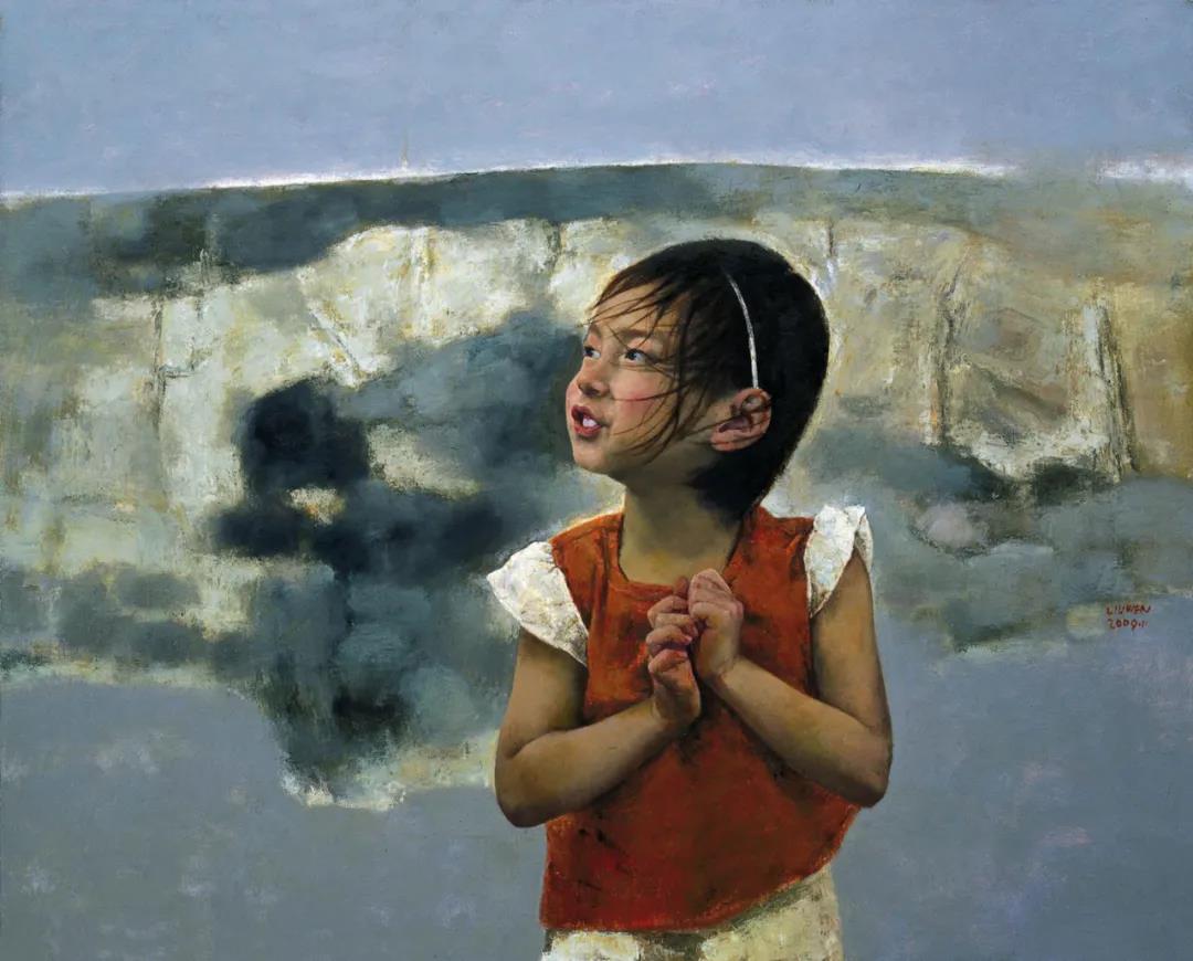 《仲夏之夢》中女孩的形象來源于即將畢業(yè)的藝術系的大學生,她是我的學生,熱愛藝術,又對藝術、對人生的前途既憧憬又迷茫,因此,畫面中女孩平視的目光透射著對藝術基徒般的虔誠、對生活的憧憬、對未來的向往,整體亮灰色調(diào)襯托出窗下逆光中的女孩,多折皺的白色裙子與背景渾然一體,素淡典雅,物象形體輪廓的處理既有實線又有模糊不定的虛線,使物象既有形又與其它物象容為一體,虛實相融,厚厚的色層、色塊、斑點呈現(xiàn)出浮雕感。整個畫面有意與偶然的色層肌理,整體的具象與局部的抽象統(tǒng)一,達到難以分辨是刻意為之的描繪還是偶然的肌理的效果。