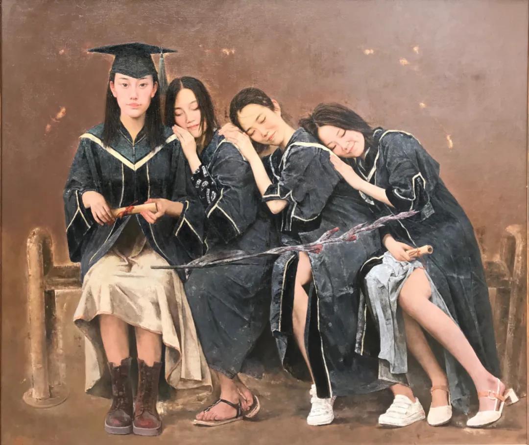 《暢想青春》,描繪即將畢業(yè)的四位女大學生,她們青春、陽光、朝氣蓬勃,暢想著即將升學或踏上工作崗位的幸福時光。畫面采用寫實的人物與平面的背景結合,使古典寫實繪畫三度空間減弱而趨于半平面化,線條的虛實處理注重動與靜的韻律,細節(jié)刻畫注重典雅精致。畫作既注重現(xiàn)實人生與時代精神的觀照,又注重藝術形式的表達,以增強視覺的張力。